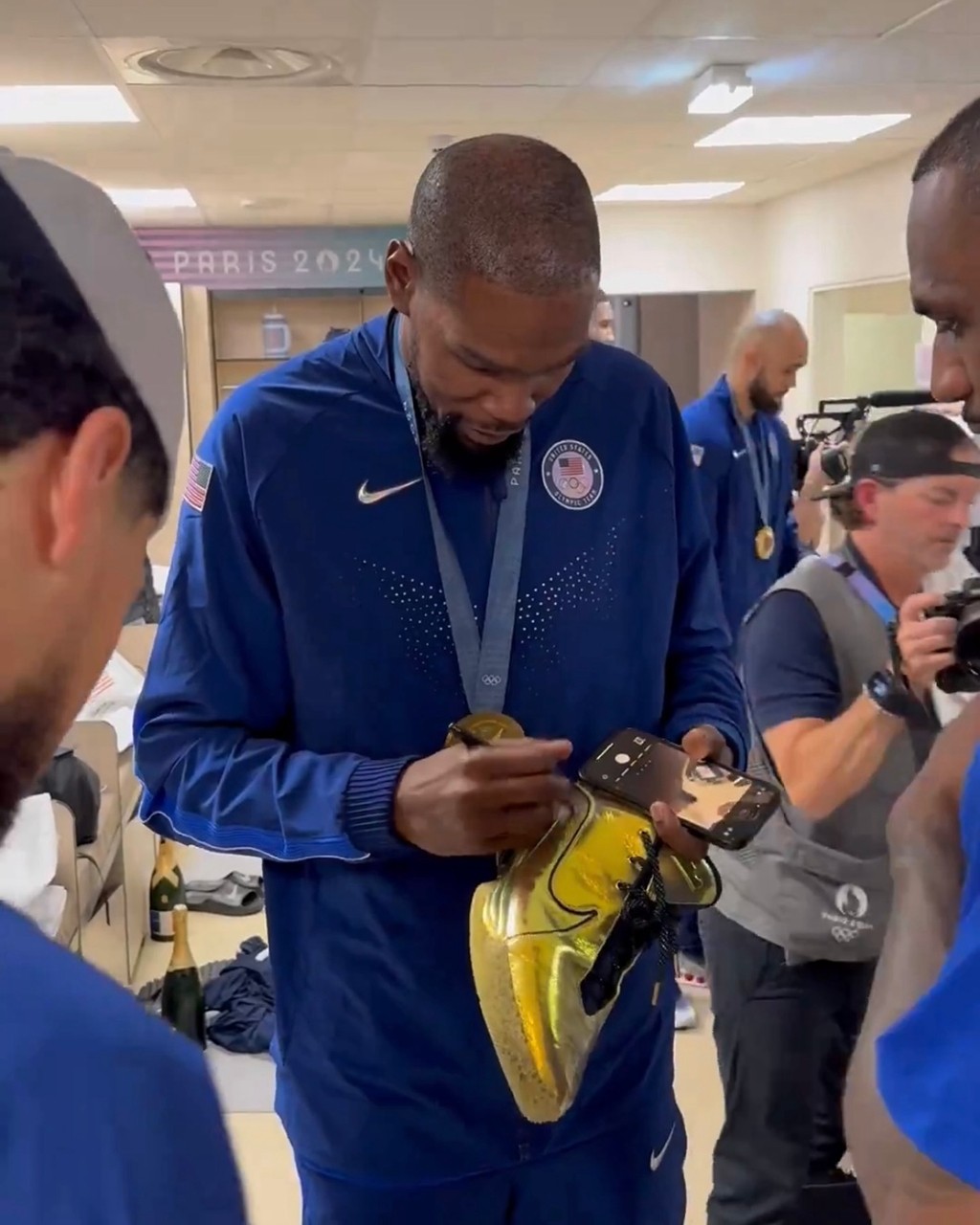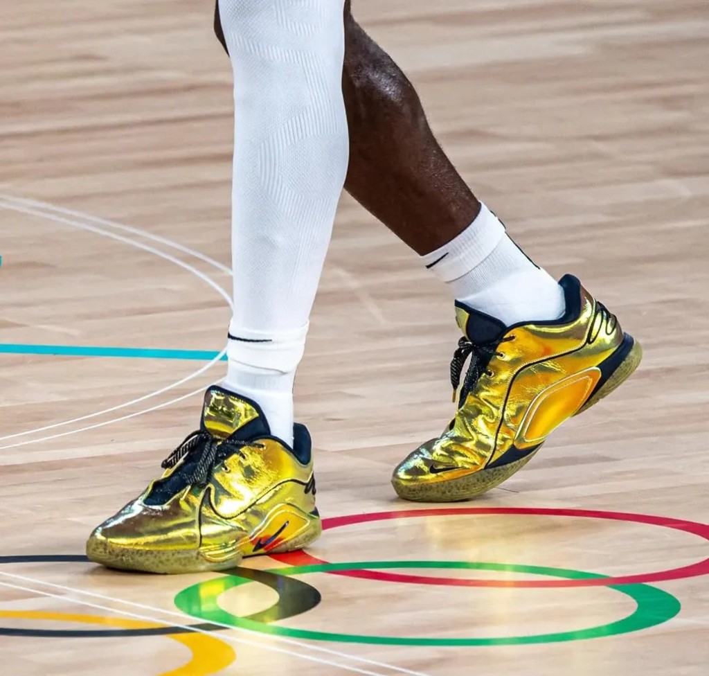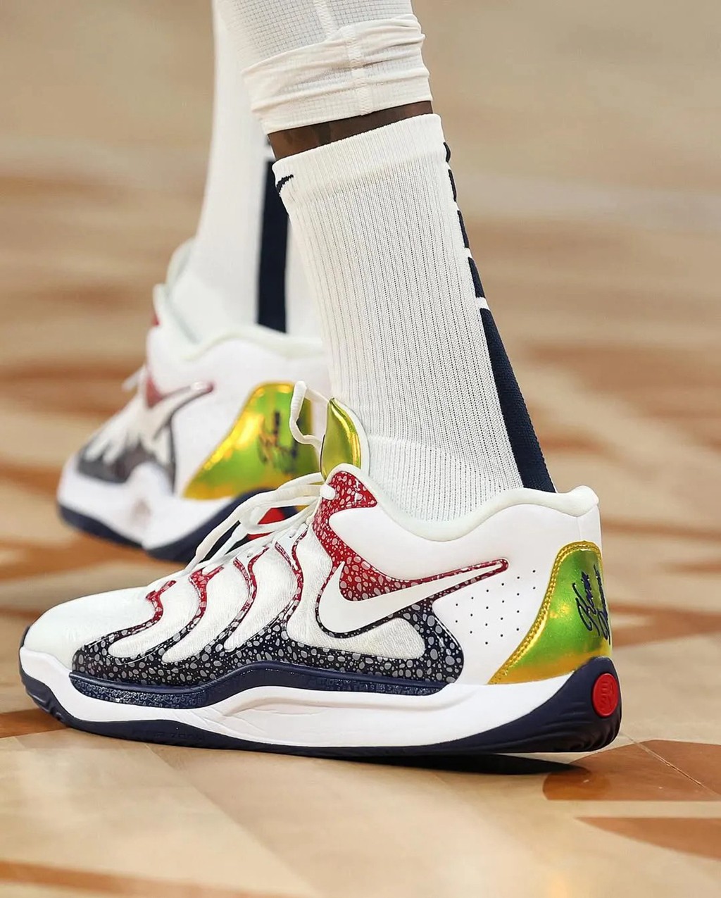 杜兰特这边将带来金牌配色 KD17,后跟一抹金色象征荣耀。