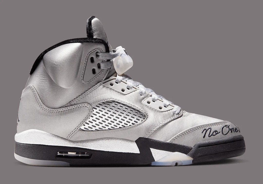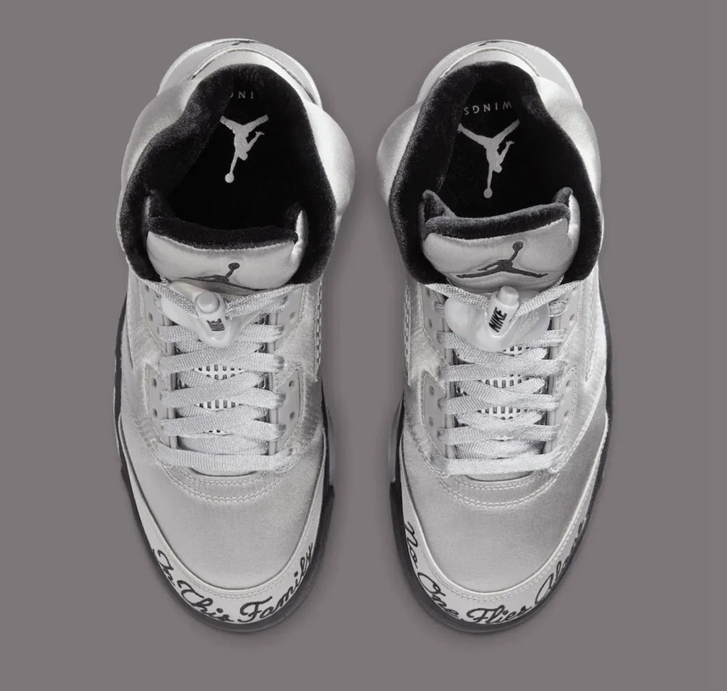 鞋款整体采用了金属色系,鞋头部分的 “In This Family,No One Flies Alone(以 Jordan 大家庭之名,我们共同飞翔)” 是 Jordan 品牌不变的箴言。