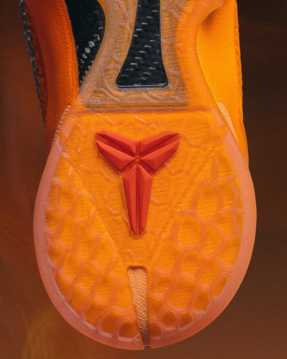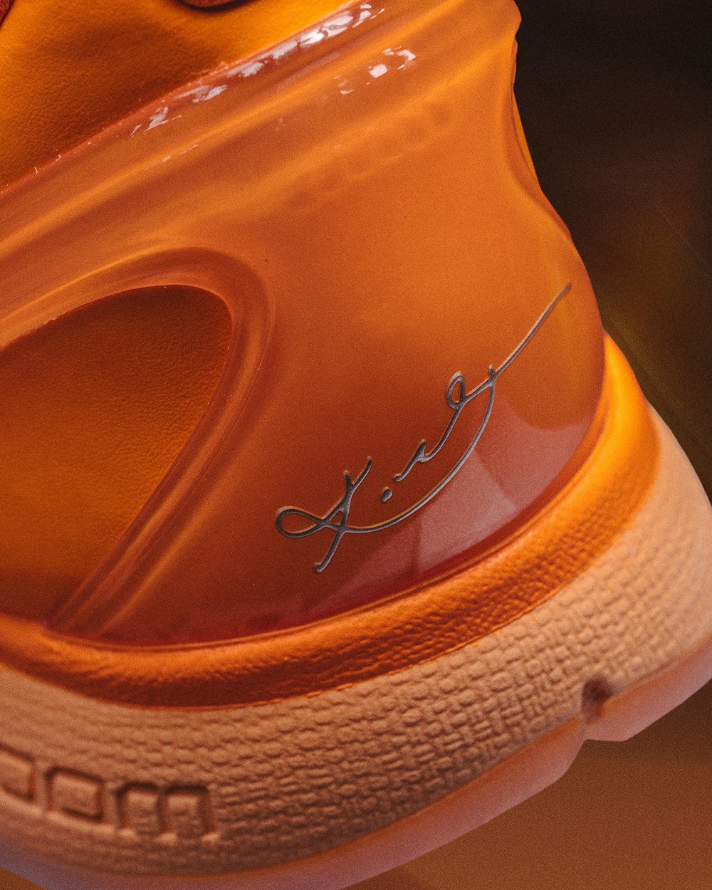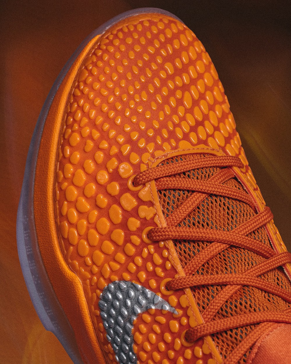 整体橘色曼巴纹理细看还有明暗渐变效果,与银色细节点缀及半透明果冻大底,共同营造鲜明的视觉层次,球场吸睛效果拉满。