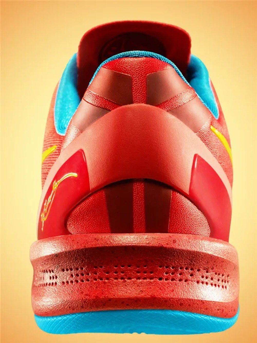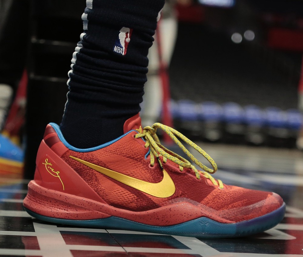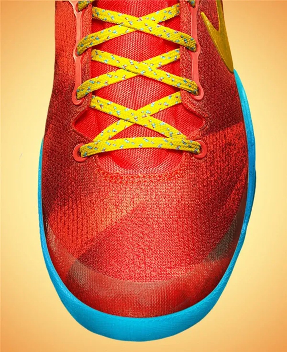 当年在 Kobe 8 中算是极具辨识度的存在。鞋身采用喜庆的红色渐变渲染,金色 Swoosh 与黄色鞋带提亮整体视觉,内衬则辅以湖水蓝衬托。