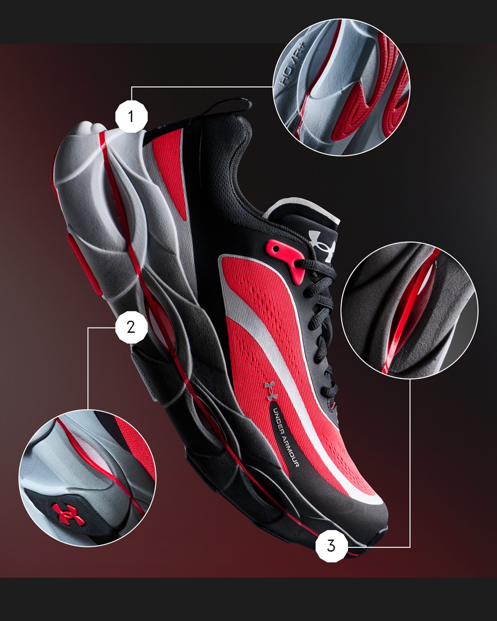 搭载的 UA HOVR+ 缓震科技与 TPU 弹簧板协同作用,为跑者的每一步带来更强劲的动能反馈。