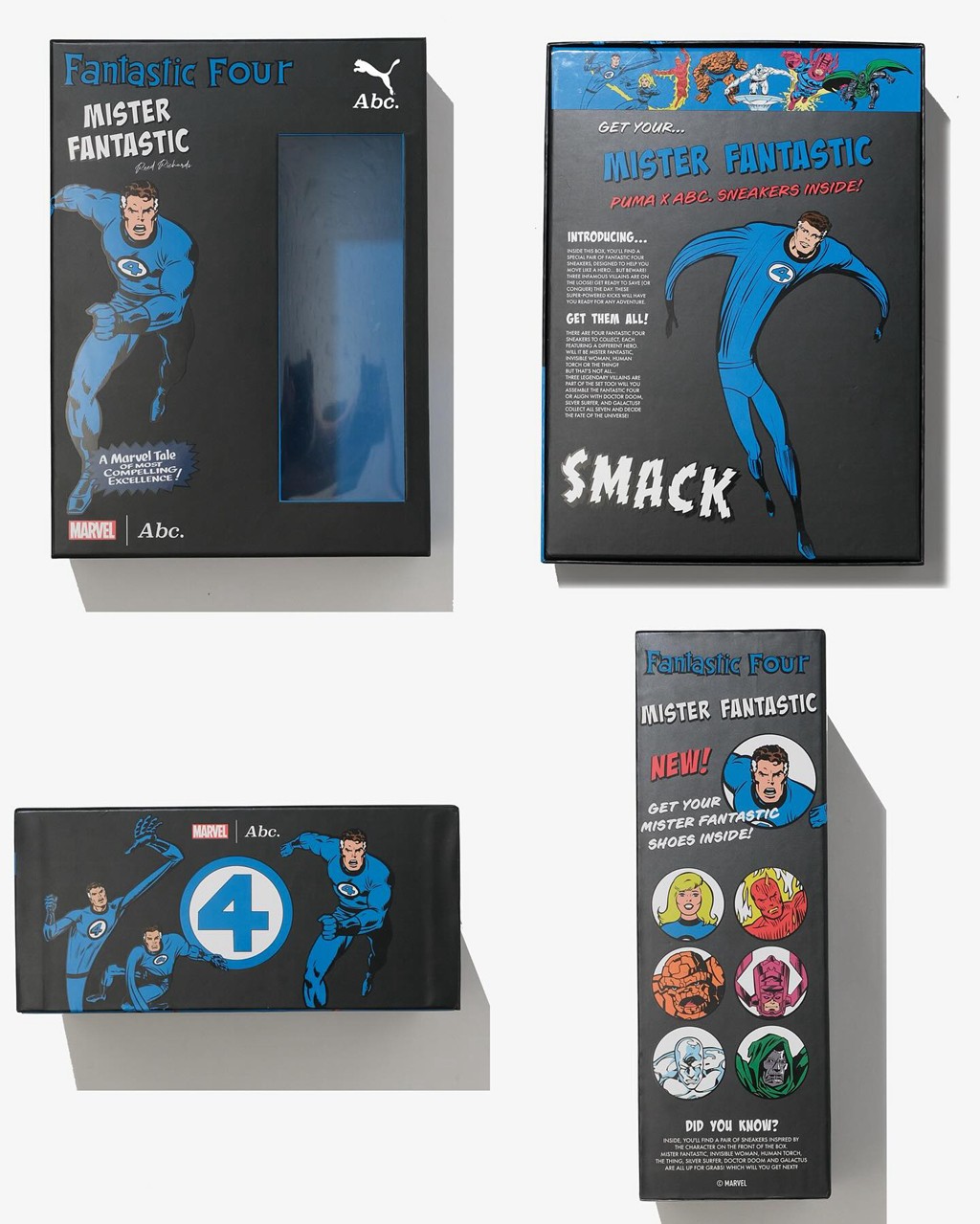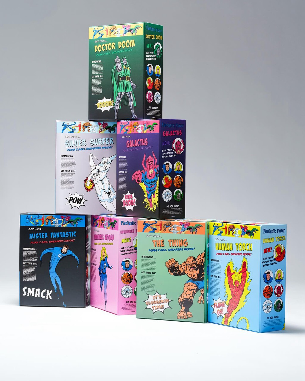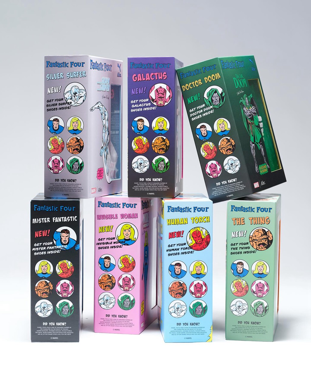 此次联名包含足足 7 双鞋,除了神奇四侠外,还有吞星者、毁灭博士、银影侠三位经典反派。