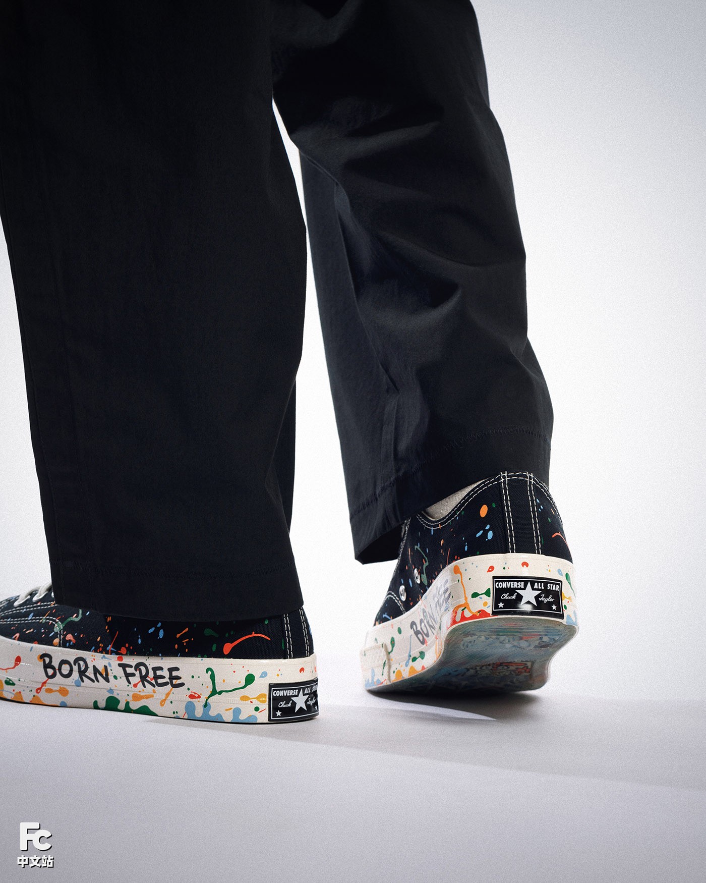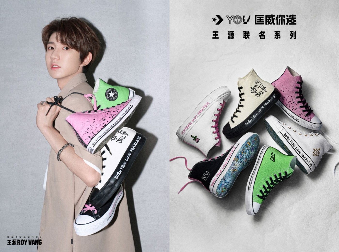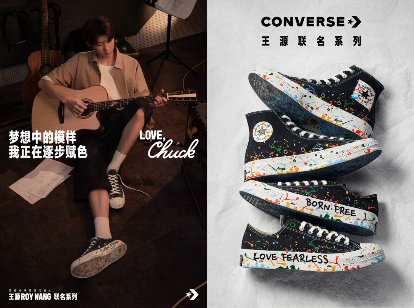 本次的王源 x Converse Chuck 70 包含高低帮款式,在经典的黑白造型之下,醒目的泼墨装扮,以及中底上的「BORN FREE LOVE FEARLESS」手绘字样,都是王源个性的体现。