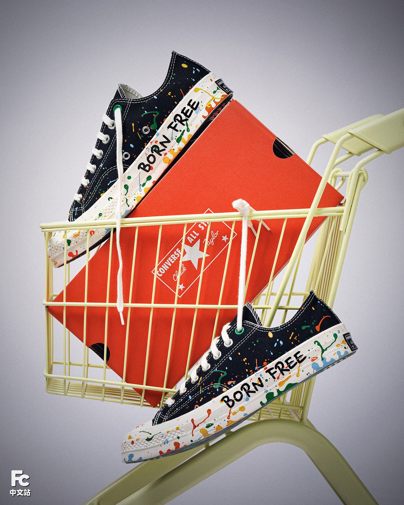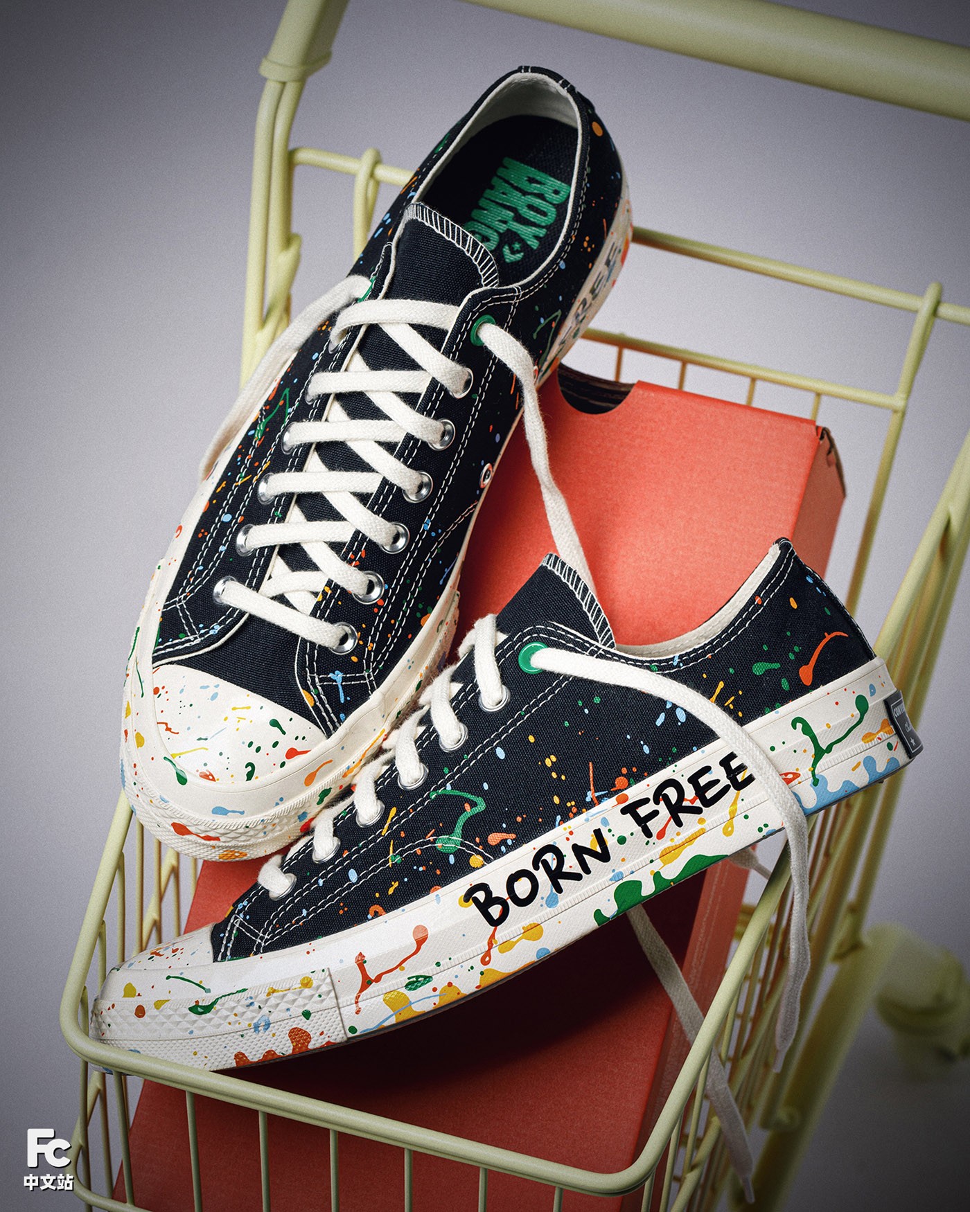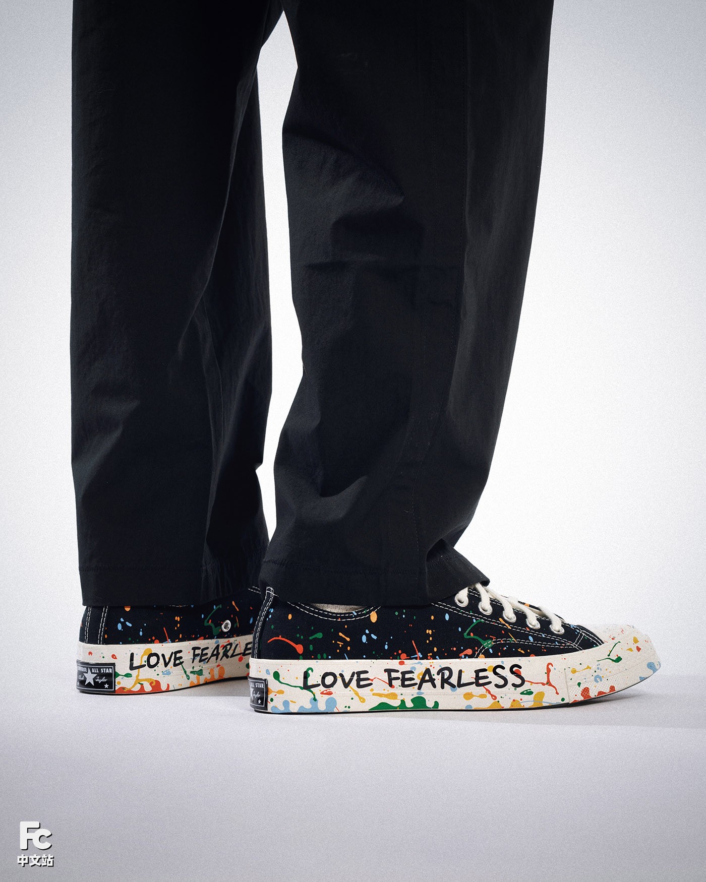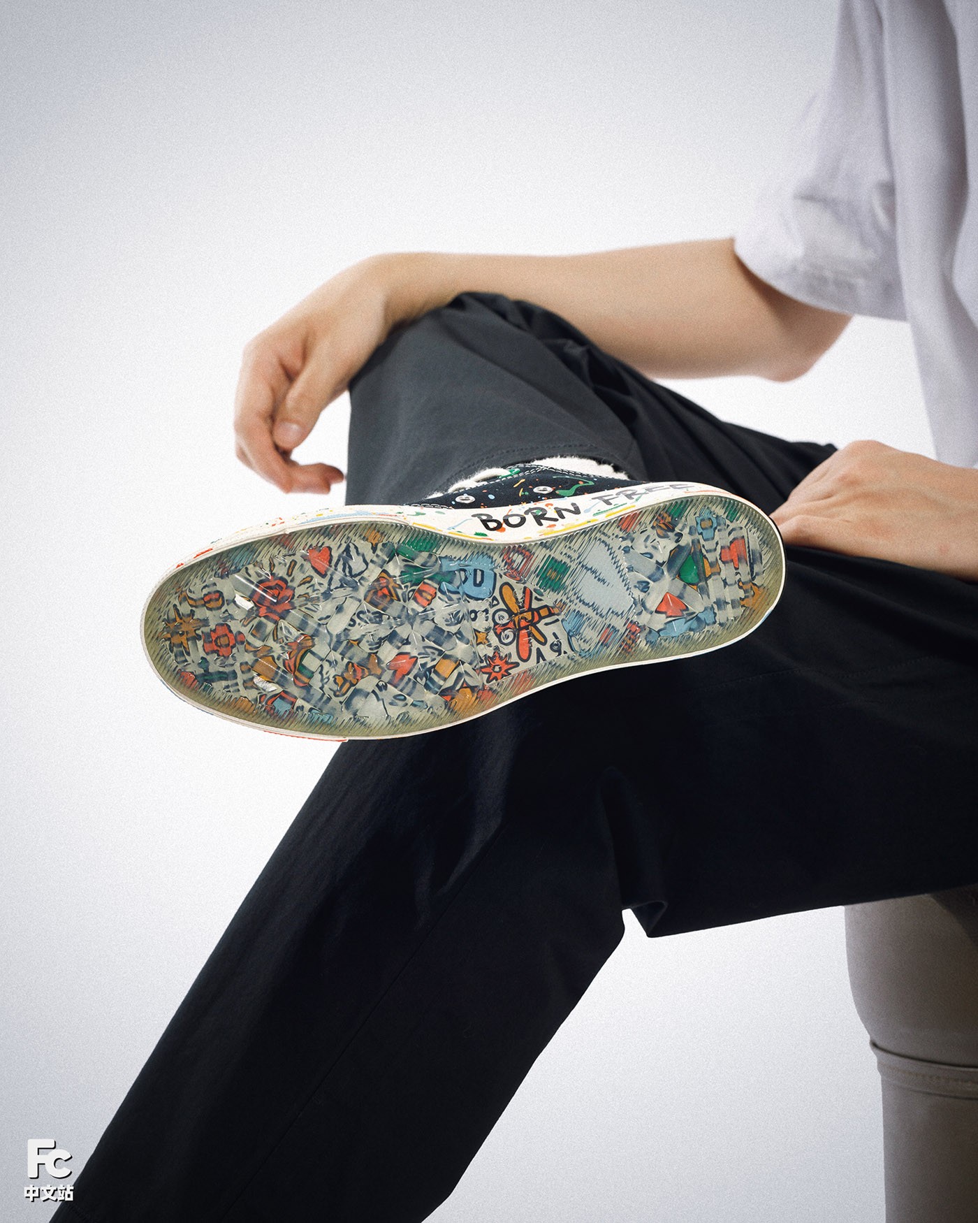 本次的王源 x Converse Chuck 70 包含高低帮款式,在经典的黑白造型之下,醒目的泼墨装扮,以及中底上的「BORN FREE LOVE FEARLESS」手绘字样,都是王源个性的体现。