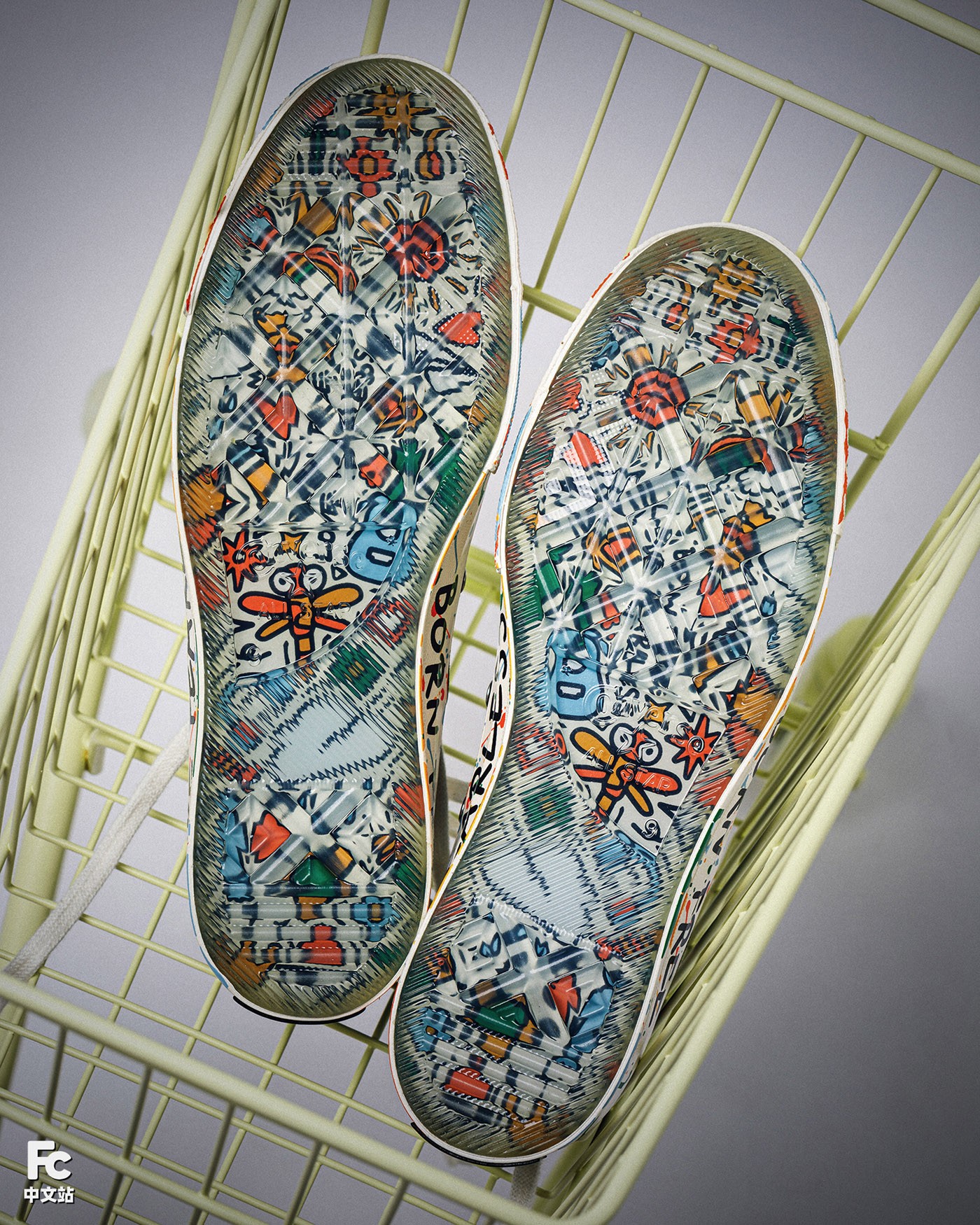半透明的水晶外底呈现了满印的涂鸦图案,灵感来源于他的音乐历程。