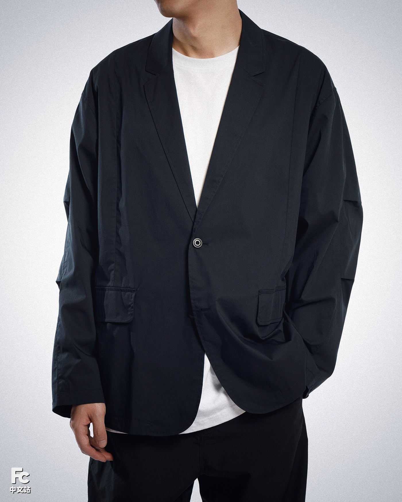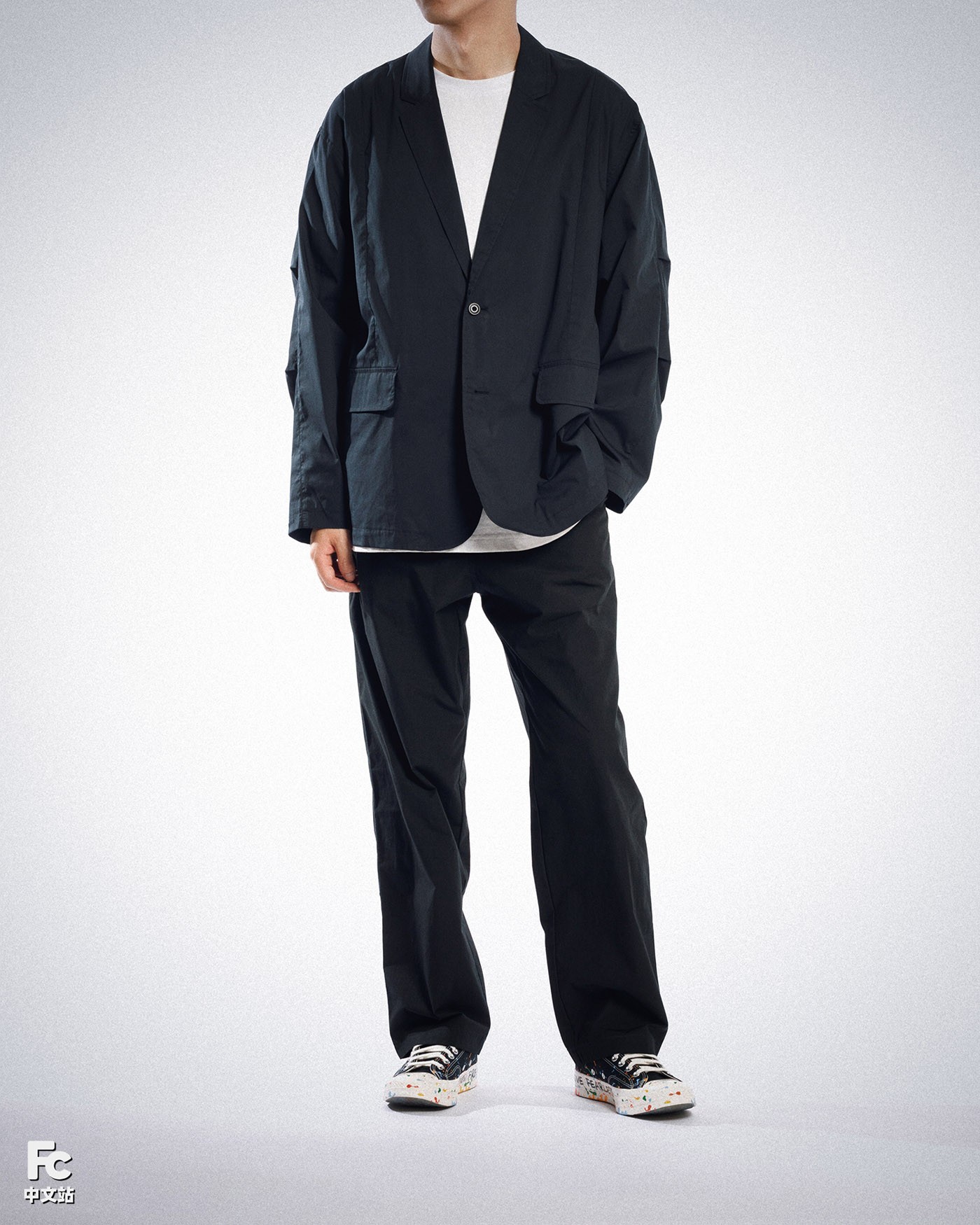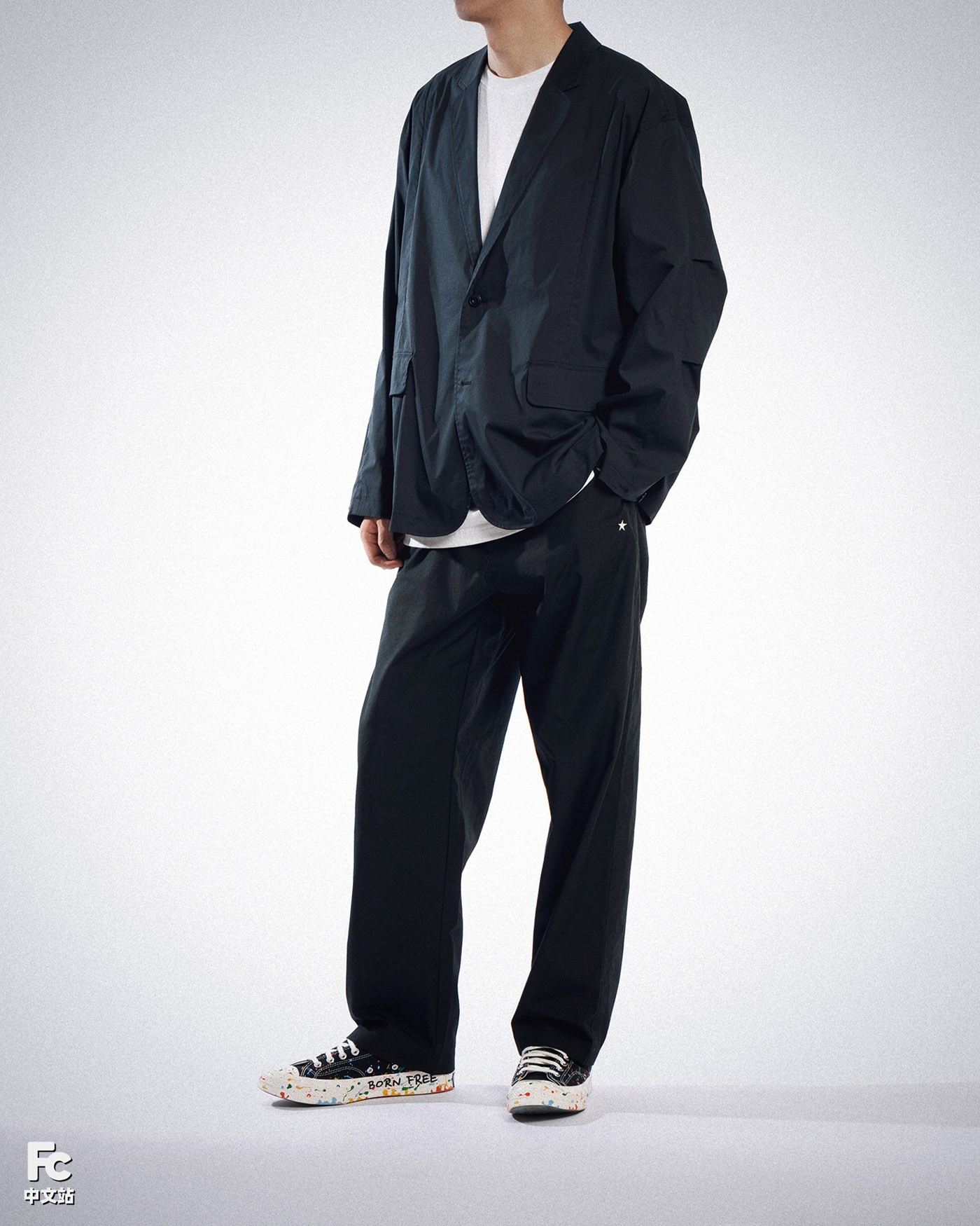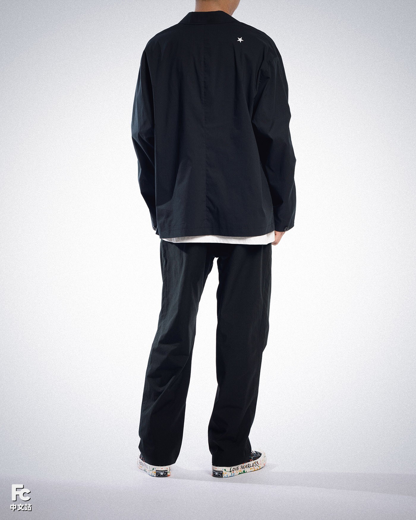 小编穿搭选用的外套和裤装同样来自 Converse 品牌,在黑色的基调上,极为克制的进行了巧妙的装饰点缀。