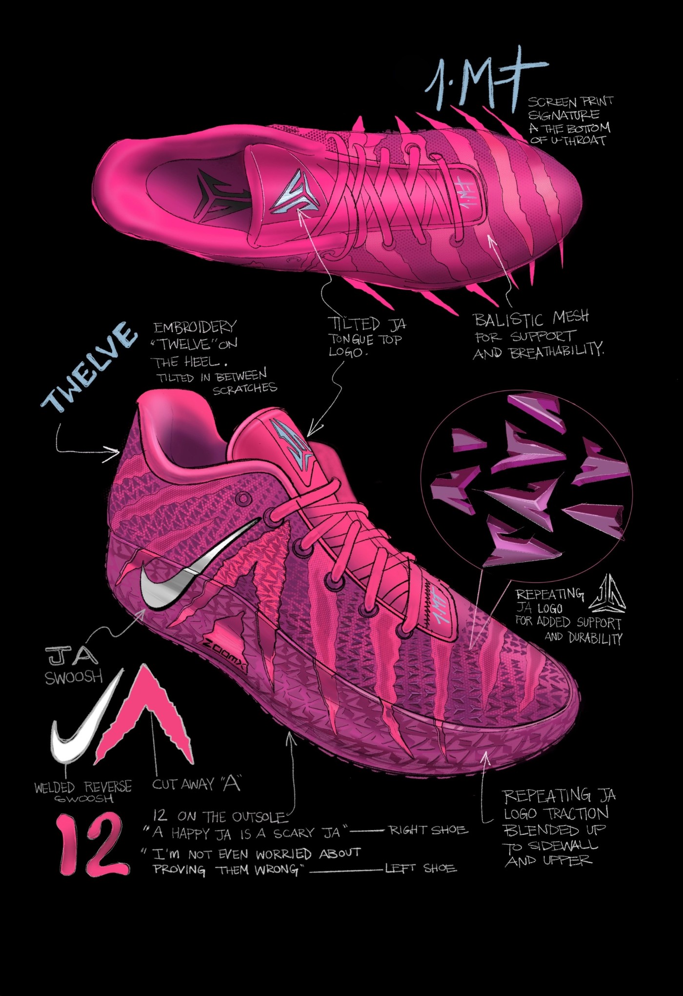 搭配鞋侧特定角度的炫彩 Nike Swoosh,构建起一个莫兰特 JA 的大标志,而且左右脚都能自然呈现,这一点特别巧,非常有 Z 世代球员的风格。
