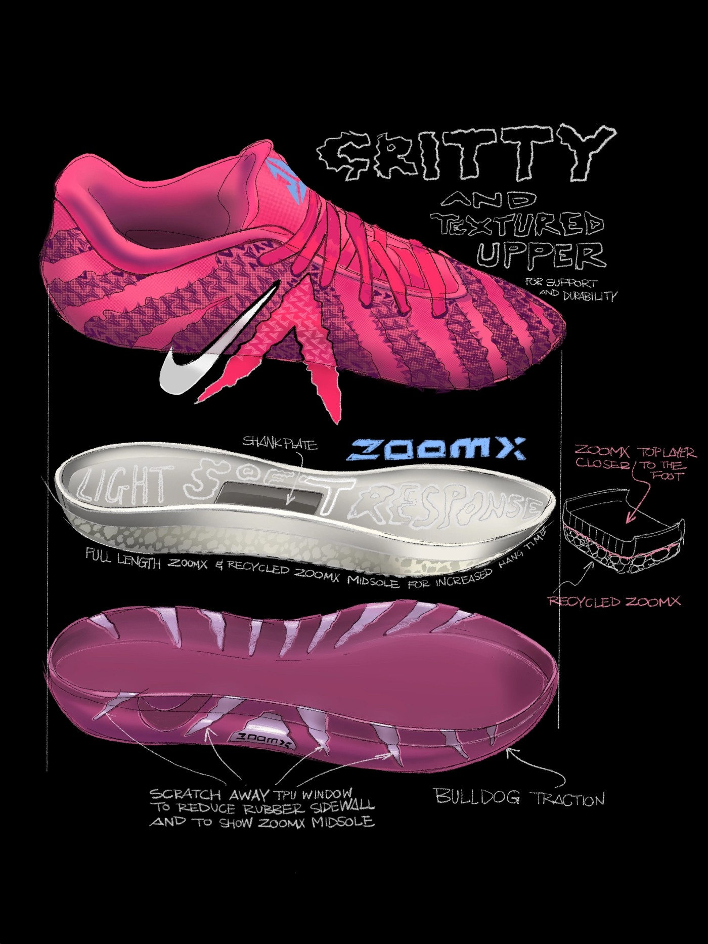 中底配置方面,从官方的设计图稿可以看出,采用上层全掌 ZoomX 泡绵叠加下层 ZoomX 碎料。