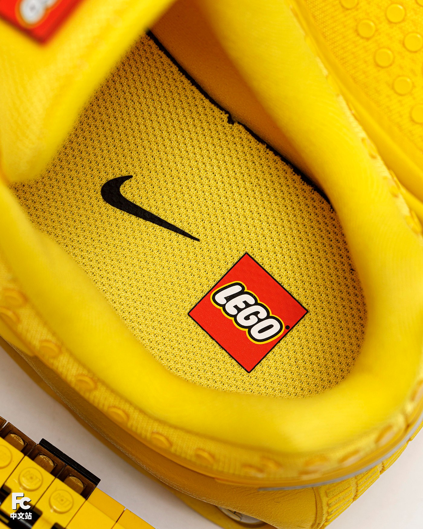 基于 Air Max 家族的气垫跑鞋打造,黄色的鞋身,搭配鞋舌上红色的 LEGO Logo。