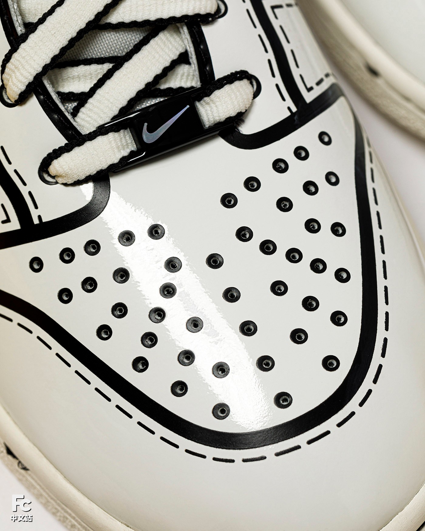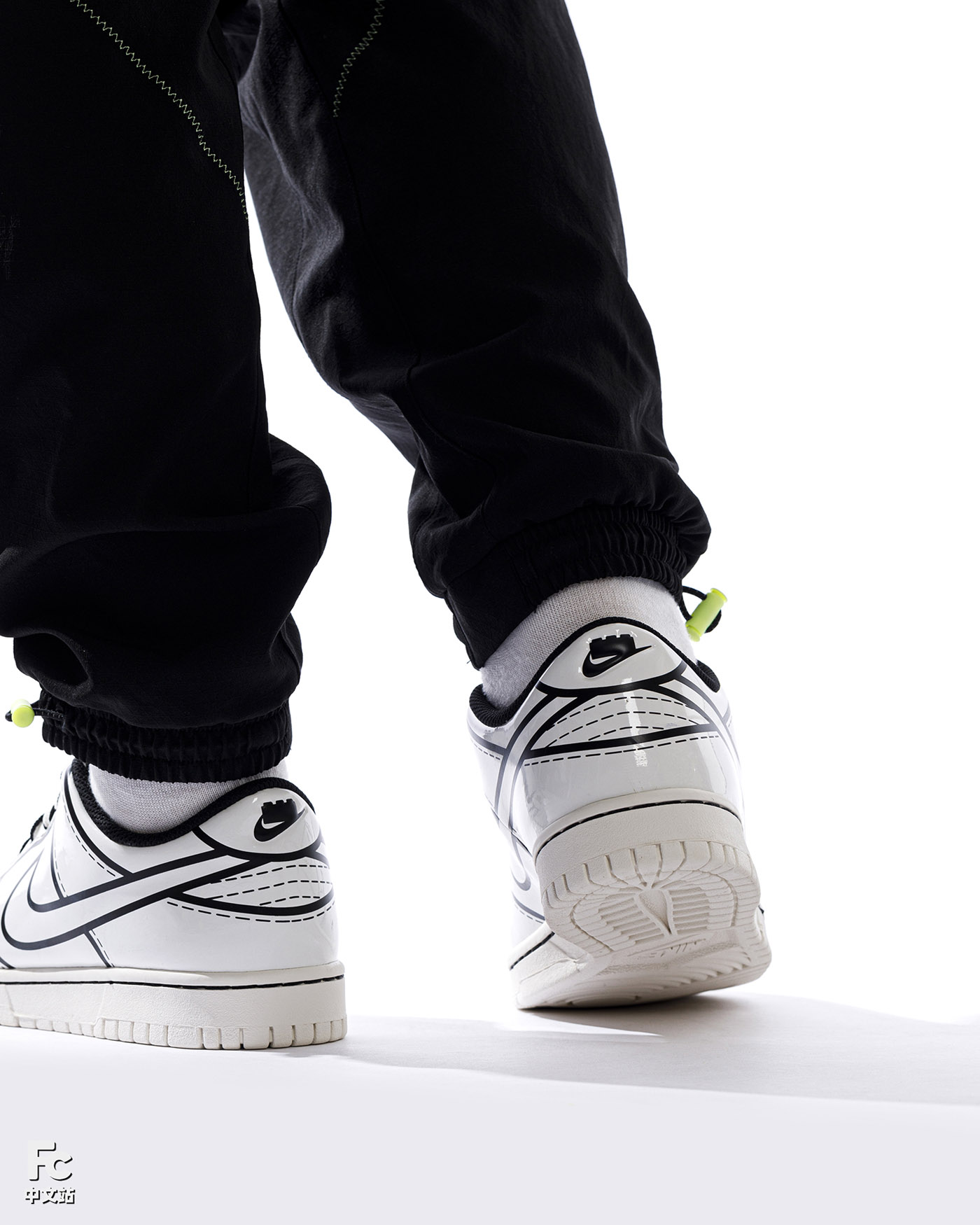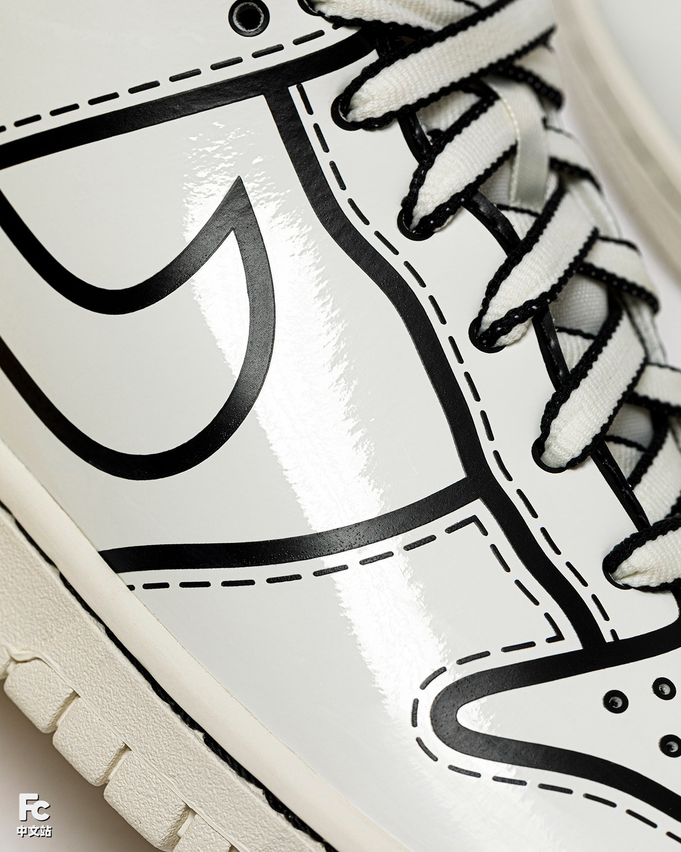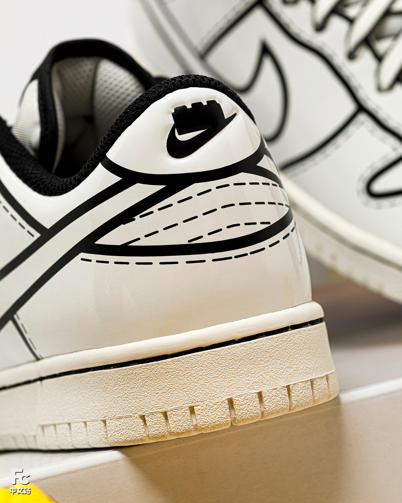 另外一双基于低帮 Dunk 打造的联名鞋款就更换了画风,以说明书中的黑白图纸为灵感来源。