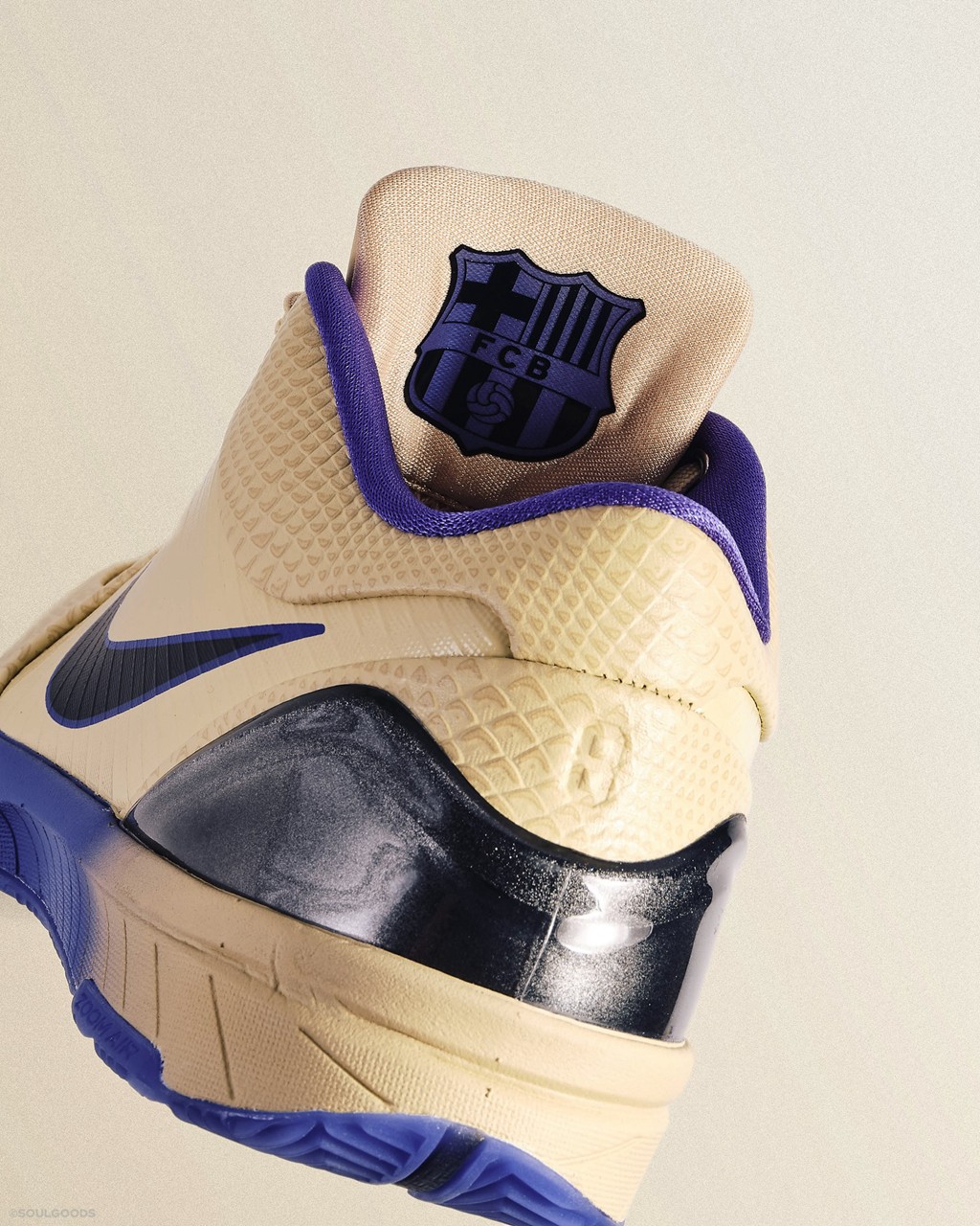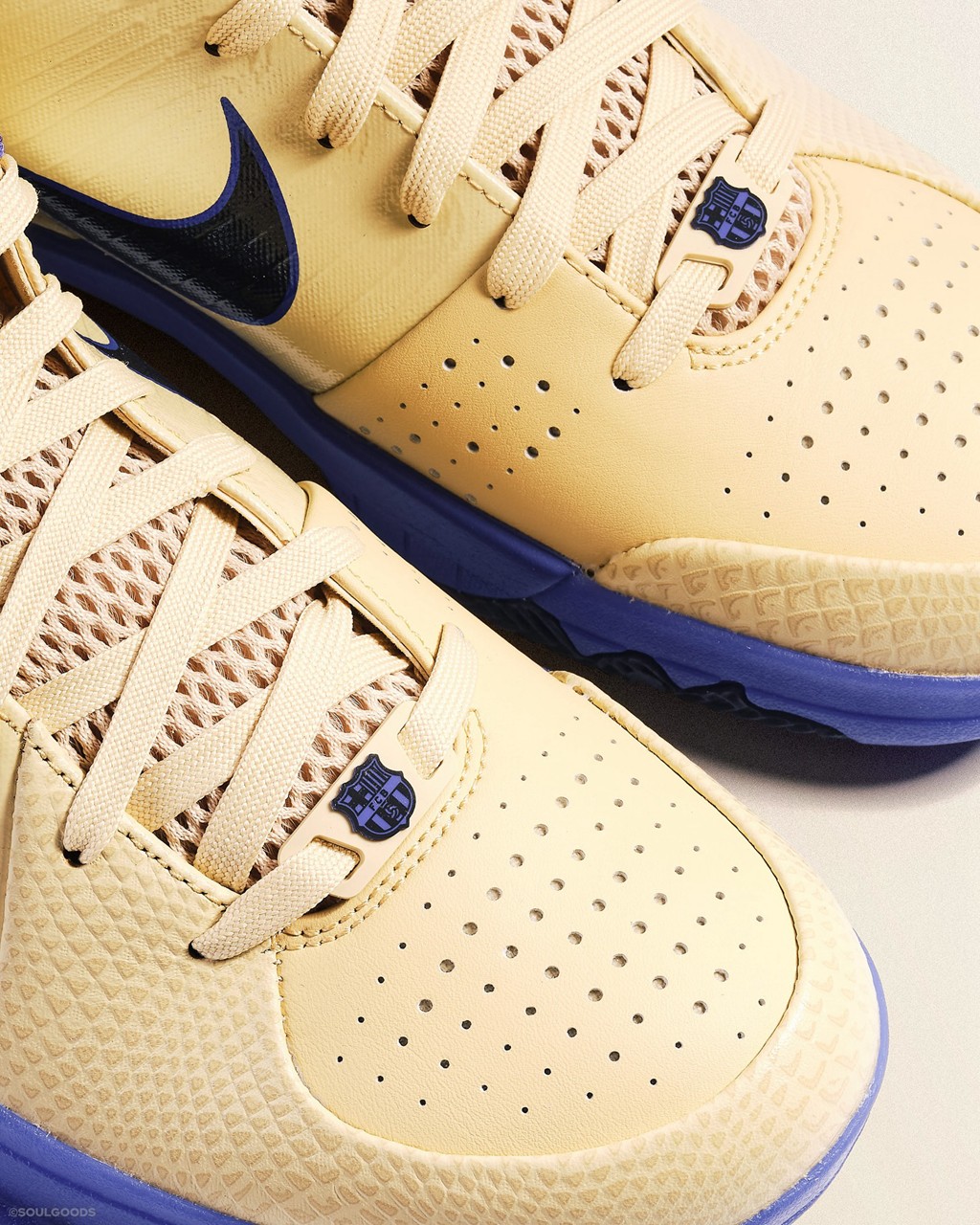 细节方面,巴萨队徽出现在各个角落,包括鞋带前段,鞋舌后方以及鞋垫。