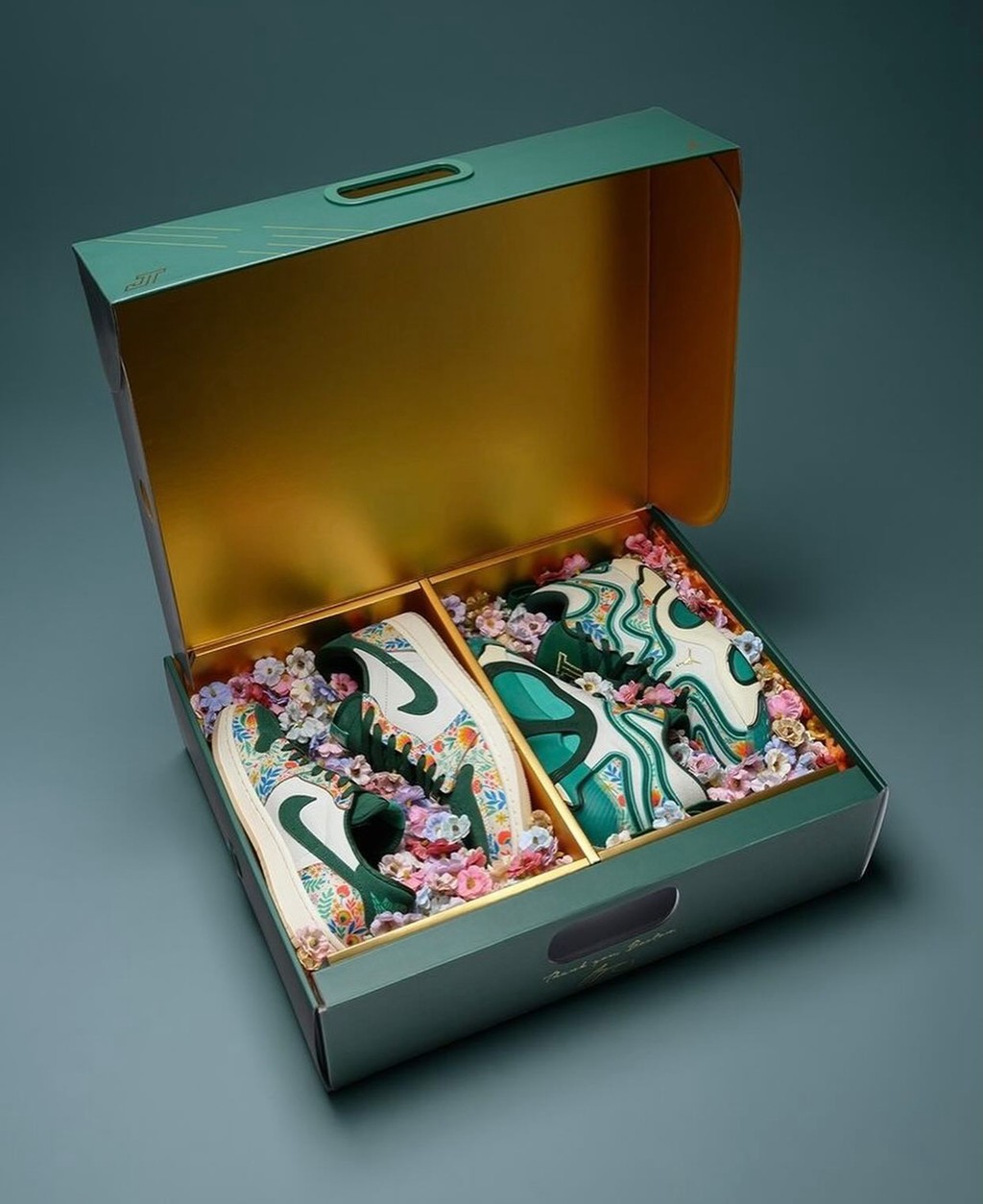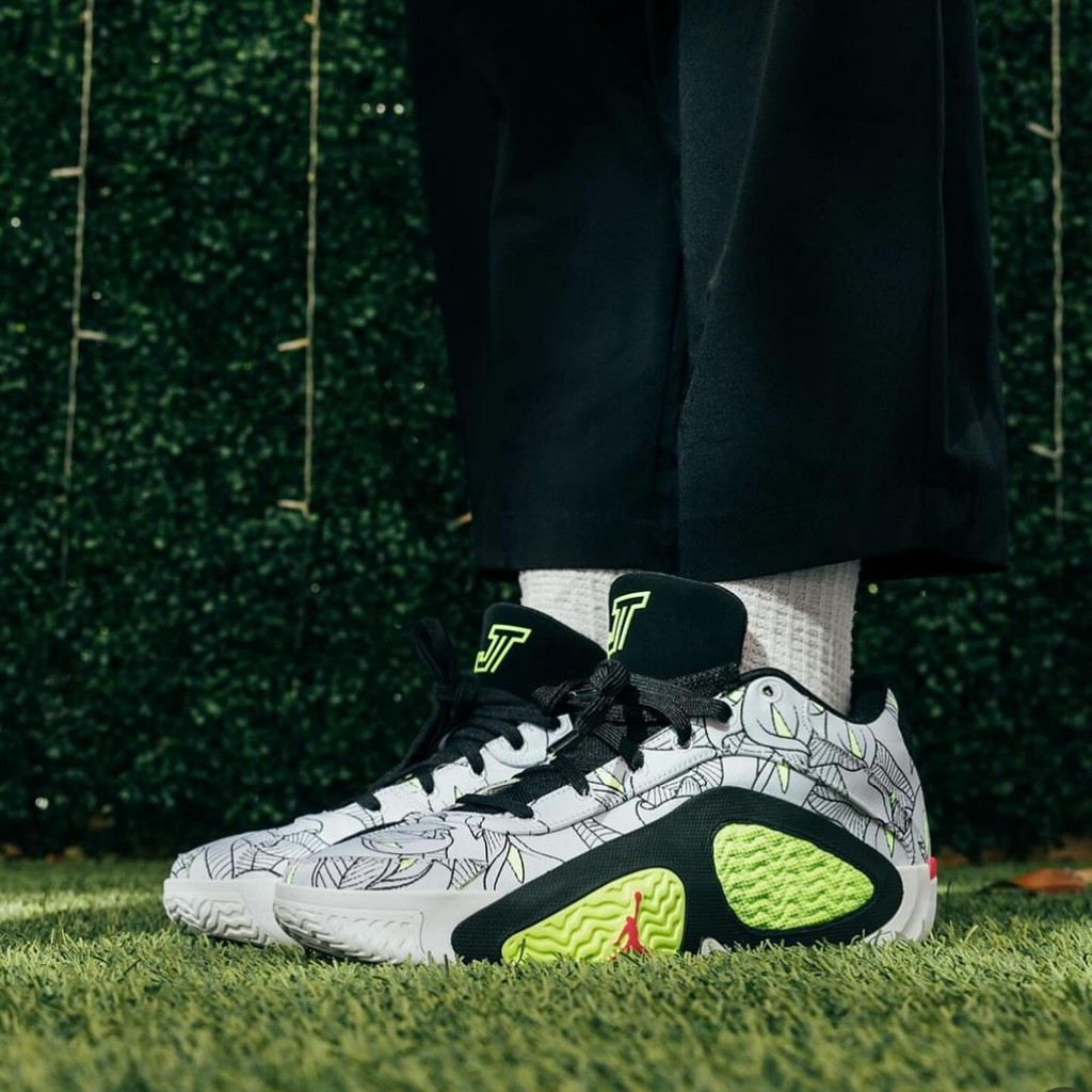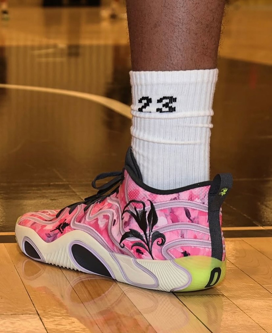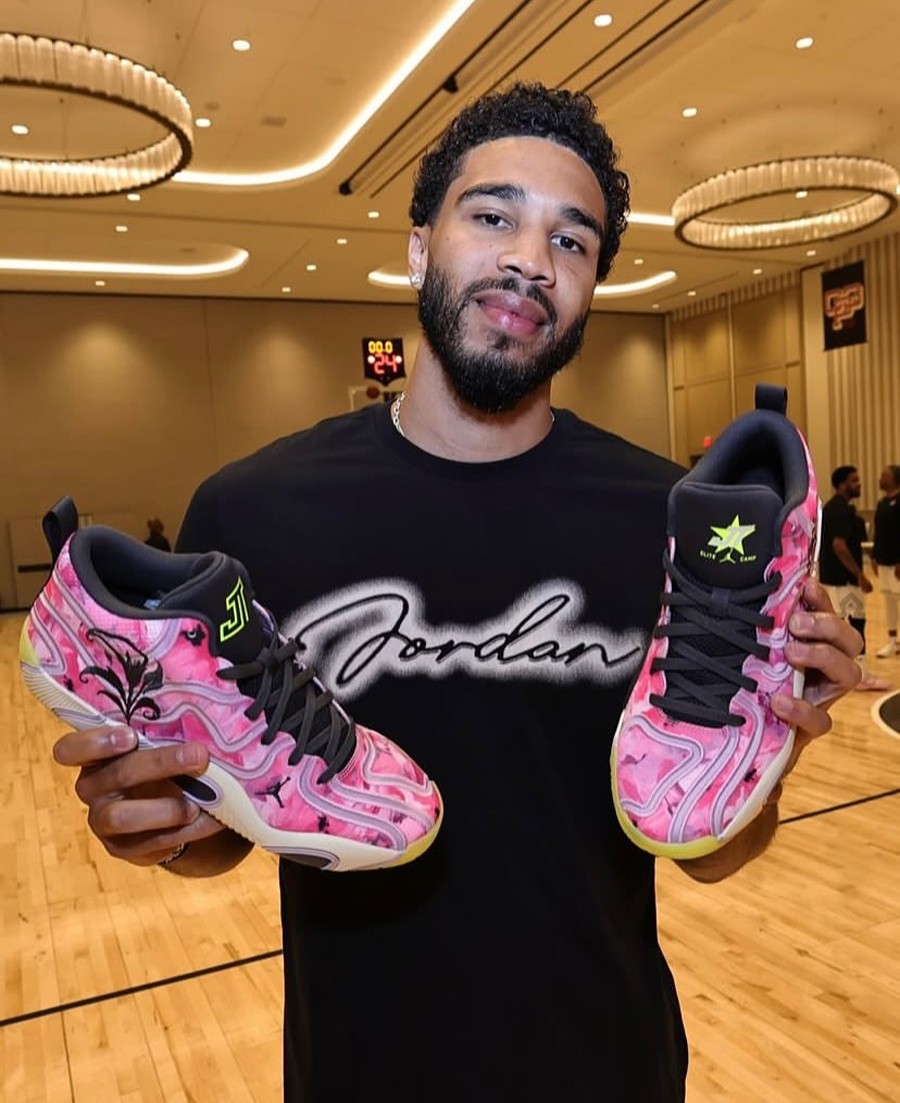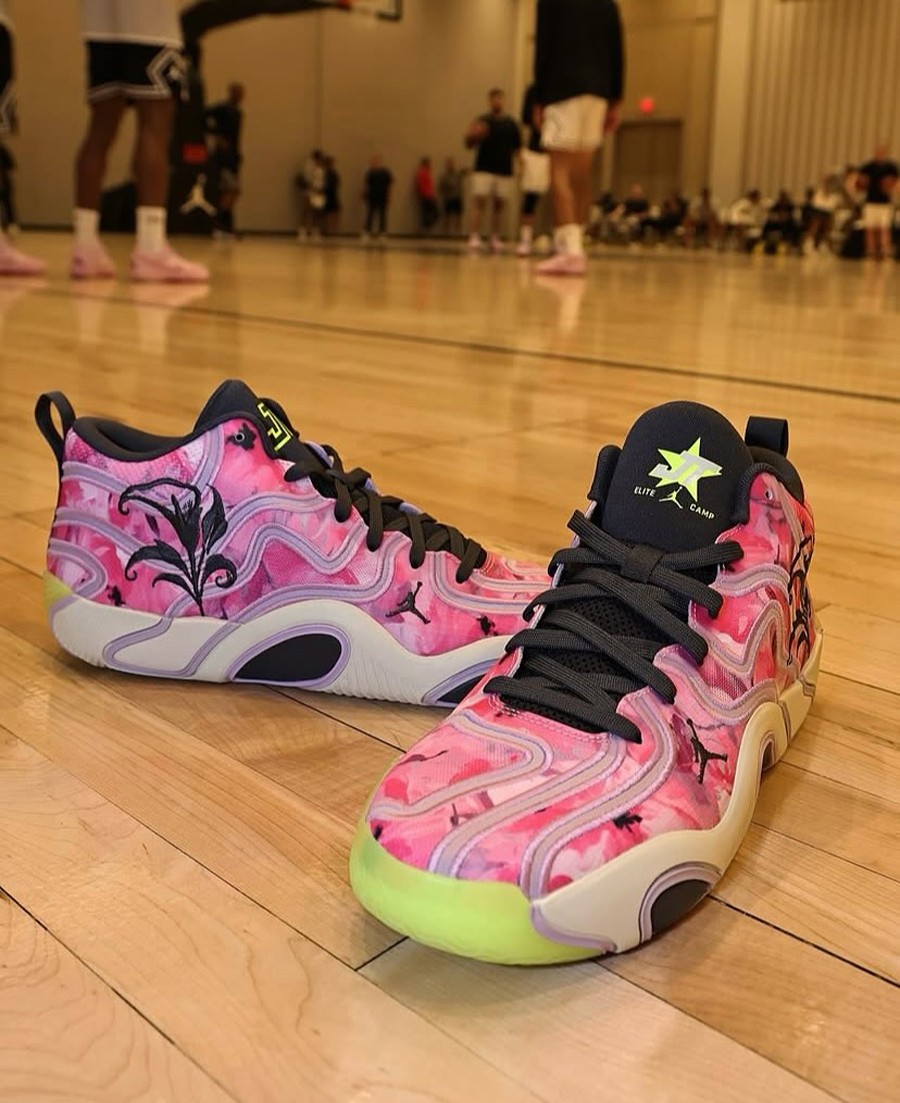 前两天保罗晒出个人专属花卉 Air Jordan 40 PE,鞋侧独有的花卉刺绣,让人印象深刻! 无独有偶,塔图姆也曝光了自己的花卉 Jordan Tatum 3 PE,同样颜值极高! 鞋身完全被粉色花卉图案笼罩,后跟还有大面积刺绣。 呼应个人战靴致敬凯尔特人主场球馆 TD 花园球馆和自己母亲喜爱的白马蹄莲主题。 鞋舌则刺绣有 Elite Camp 精英训练营主题,预计暂不会市售,我们也只好先过过眼瘾了! ▼ 以往花卉主题的 tatum 球鞋回顾