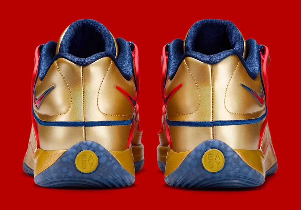 配色简单粗暴,就是金色鞋面搭配美国队的海军蓝和红色。