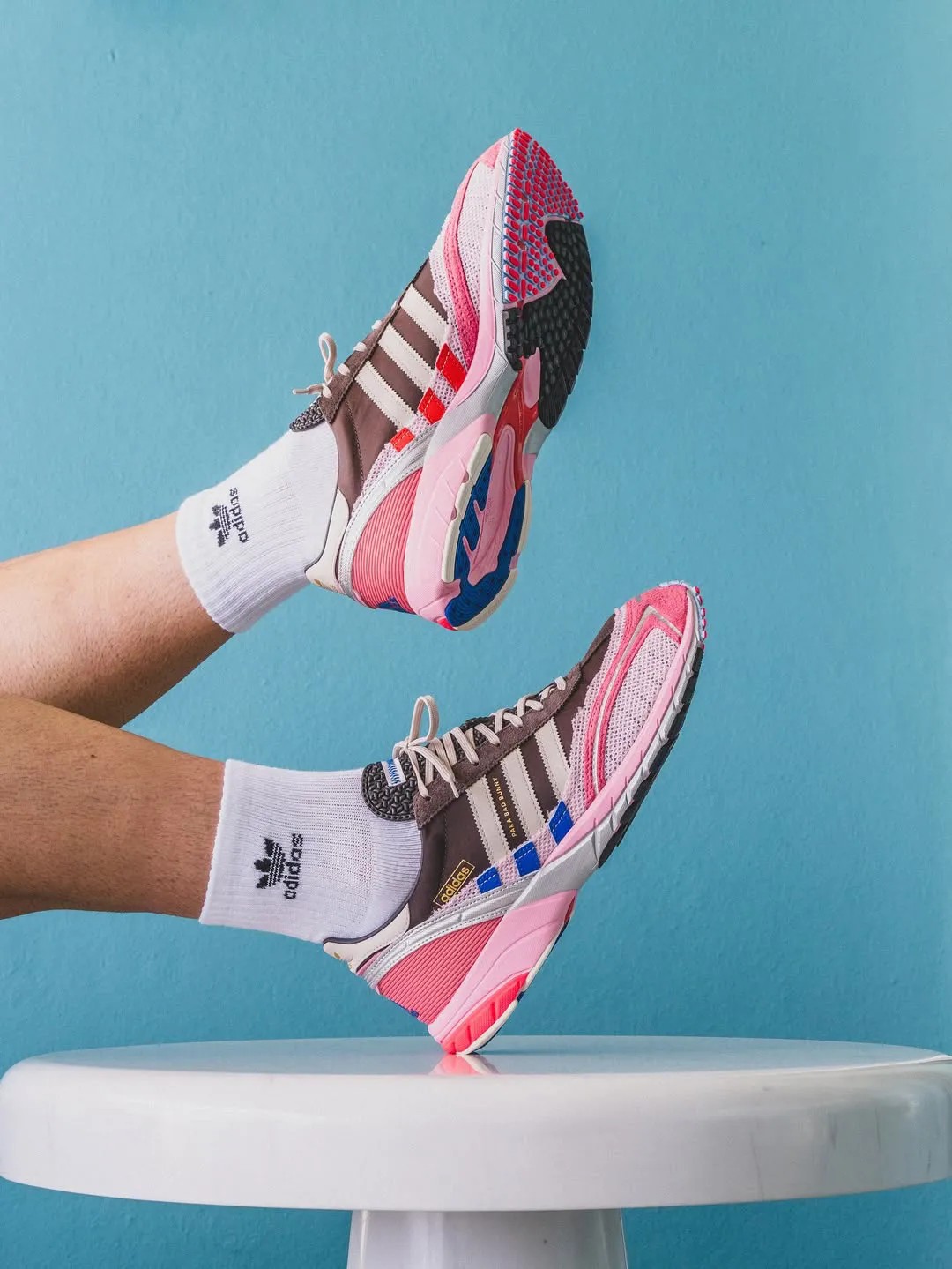 棕色为主调,辅以粉蓝撞色细节,搭配多种材质打造的鞋面,无论配色还是质感都是十分特别的一双鞋。