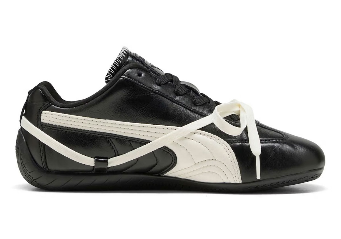 该系列由两双鞋组成,第一款是经典的 Speedcat 鞋款,采用黑色和奶油色皮革制成。