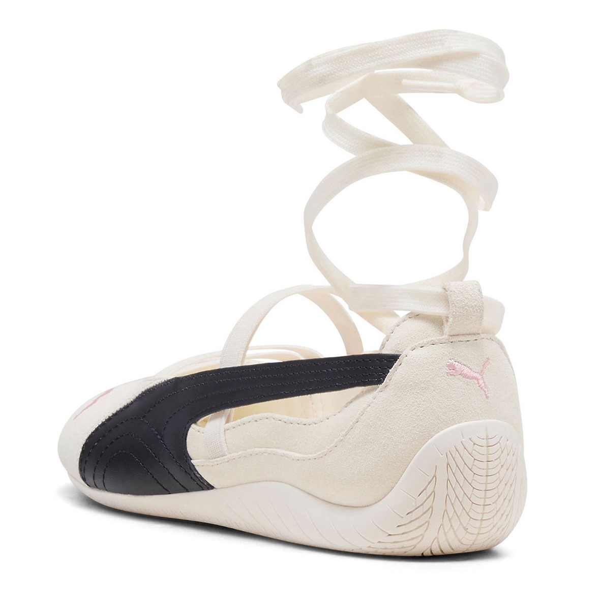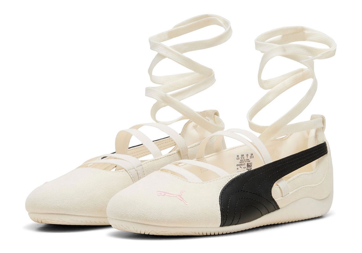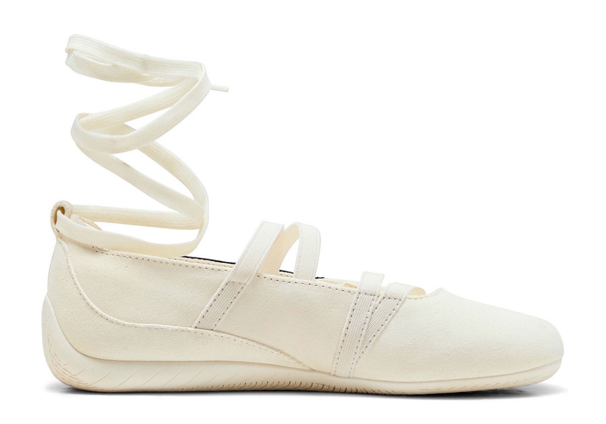 另一双 Speedcat Ballet 鞋领更低,搭配飘逸的环绕式脚踝绑带,彰显时尚前卫。