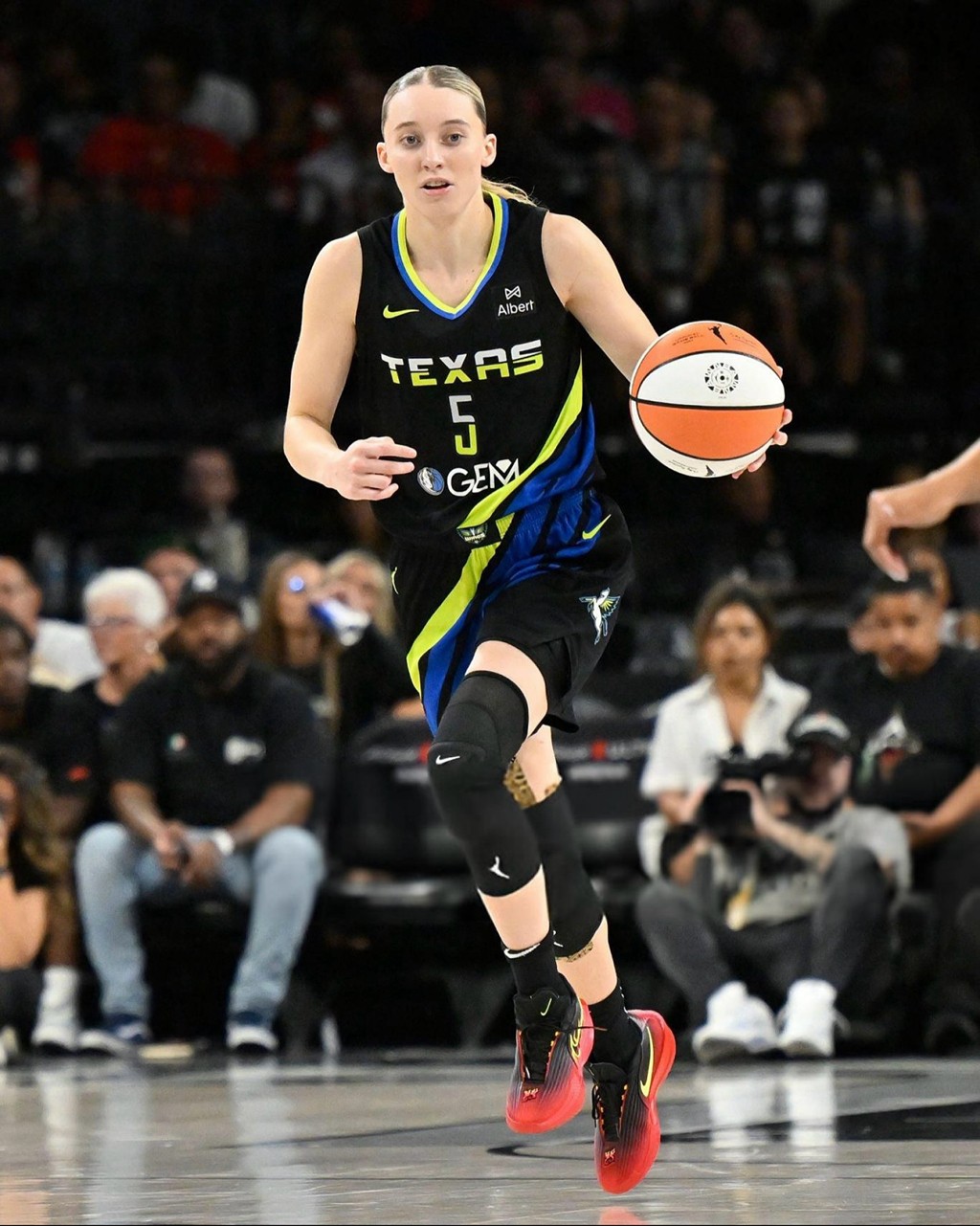 现在想看亮眼的球鞋,真不妨多关注 WNBA 赛场。 新科状元佩奇·布克斯继 GT Cut 4 之后,又穿上了全明星火焰配色 GT Cut 3 Turbo。 鞋型本来就已经足够帅,这次又追加火焰纹章,让颜值更上一层楼。 尤其是和达拉斯飞翼队的球衣形成鲜明反差,进一步彰显鞋款的出众外观。 黑色鞋面和黑色袜子十分契合,更具视觉一体性。 不过目前这双战靴尚未释出发售信息,我们将持续关注并第一时间报道。 Pic via:soleretriever