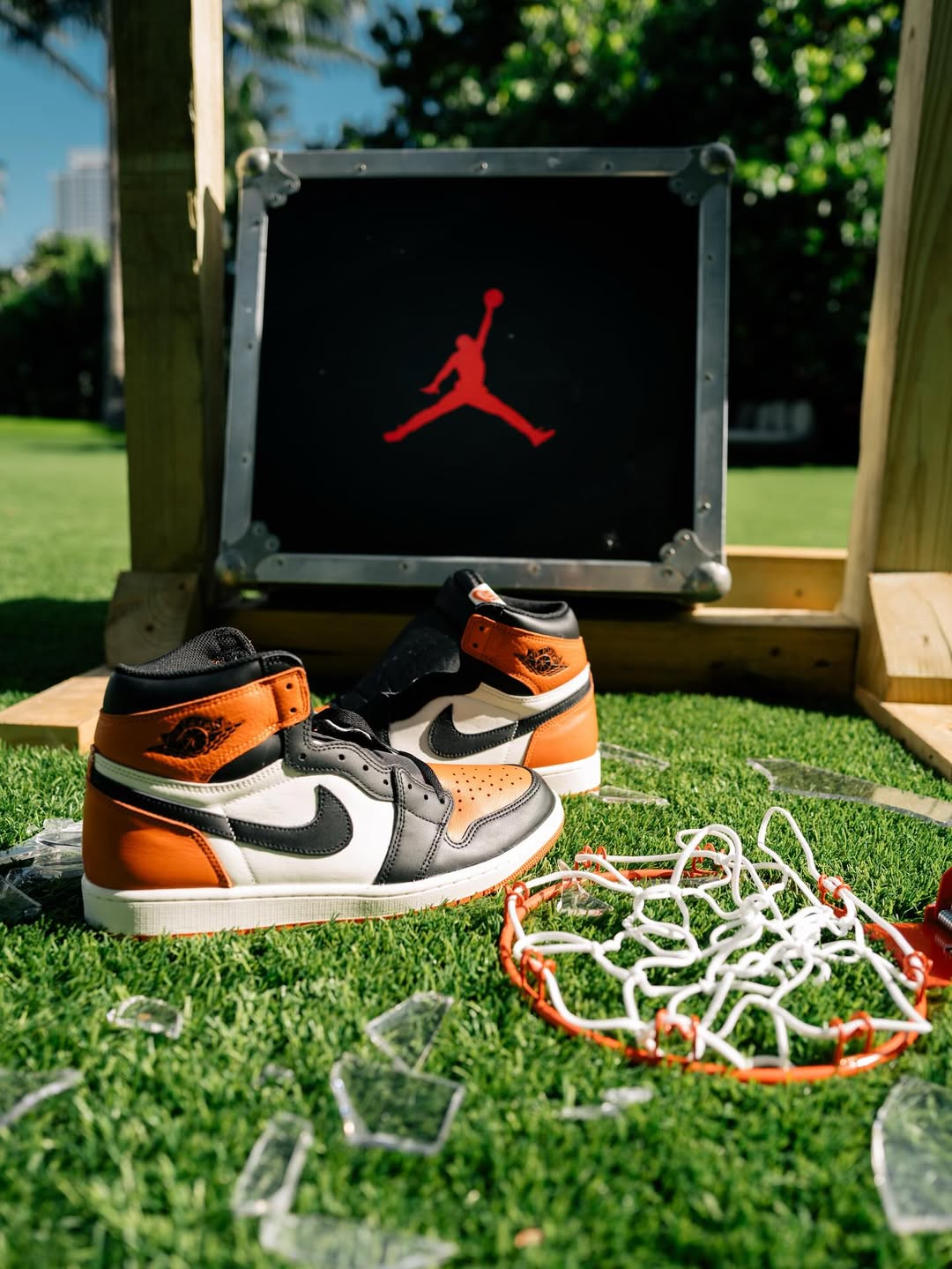 脚踩「扣碎」AJ1 ,双手持球完成飞身暴扣,将篮板扣得粉碎。