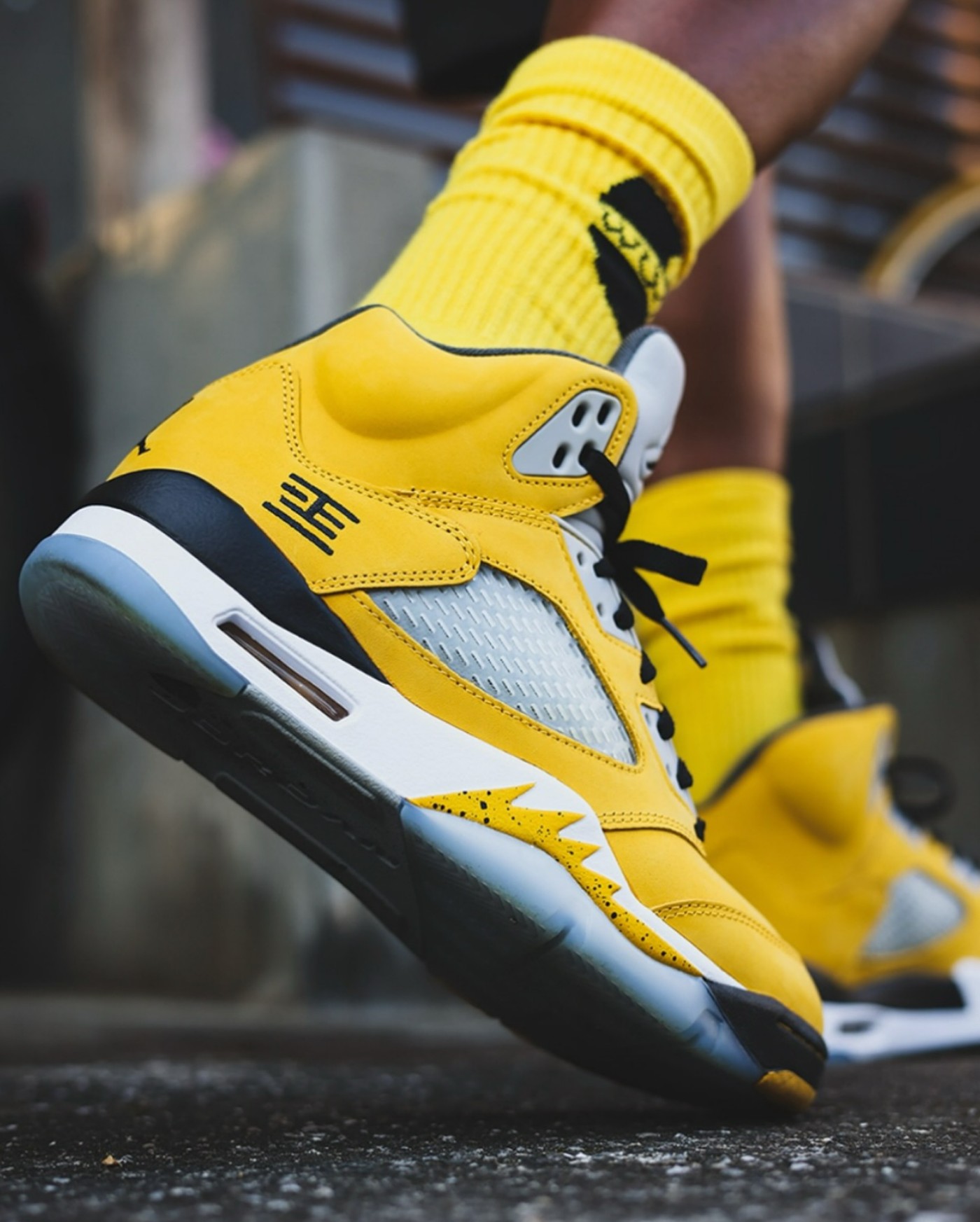 鲜亮的黄色装扮搭配后跟源自涩谷的图腾 Logo,在一众 AJ5 中显得尤为特别。