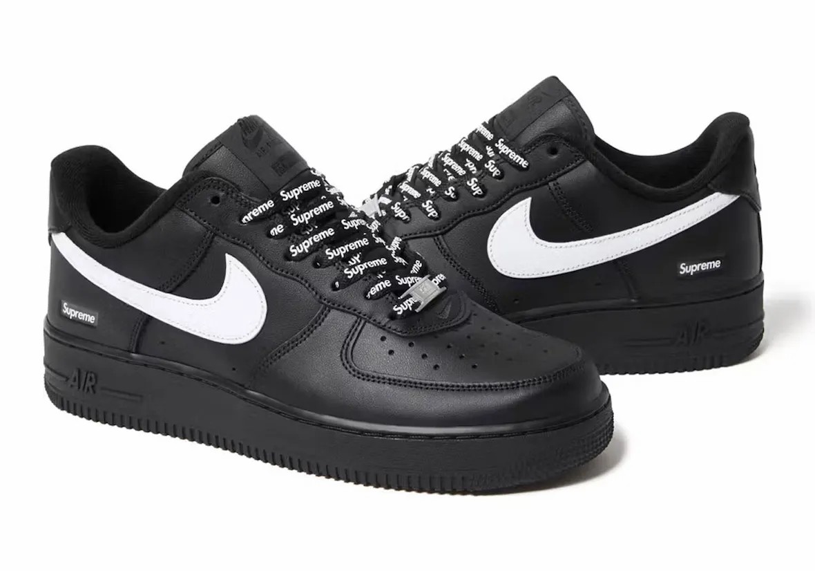 整体依然保留了之前的配方,均附赠有串标形式的鞋带,但后跟位置 Supreme 标志性的红色 Box Logo 改为黑色呈现。