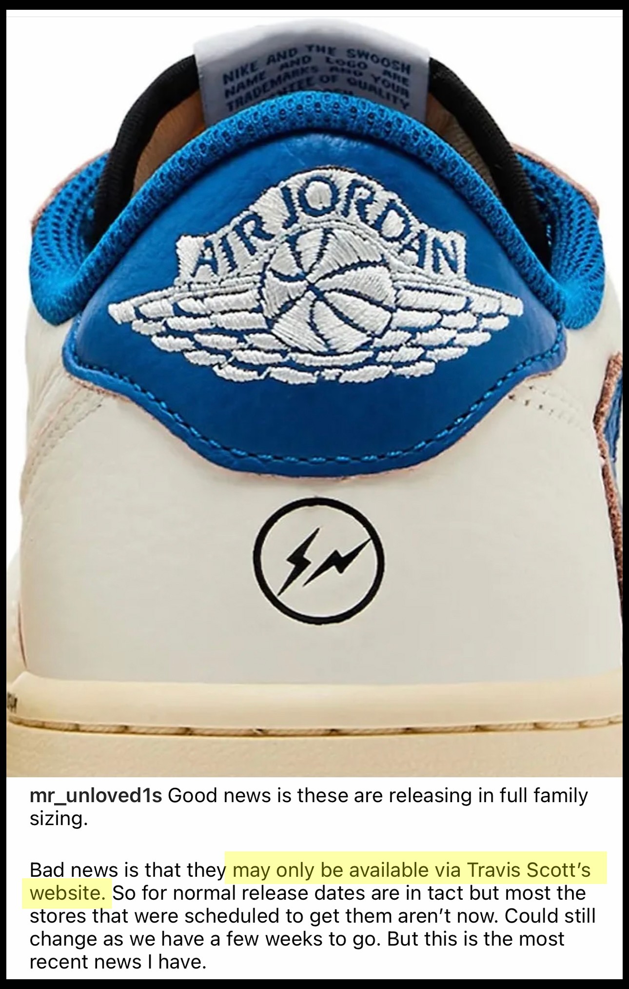 恐怕是本月最具话题性和号召力的联名球鞋,曝光多时的「闪电倒钩 2.0」Travis Scott x fragment design x Air Jordan 1 Low OG 最新传出新消息,不过可说是喜忧参半。