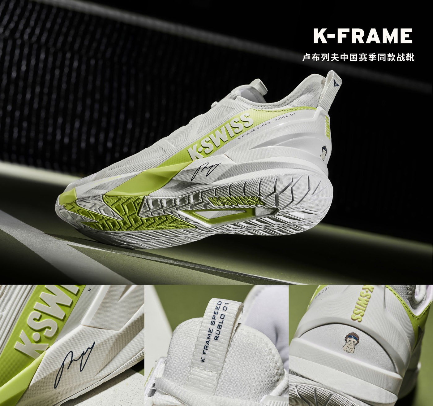 卢布列夫的 K-FRAME SPEED RUBLO 则以白配酸性绿条纹为特色,融入 RUBLO Logo、签名及卢布猫元素。