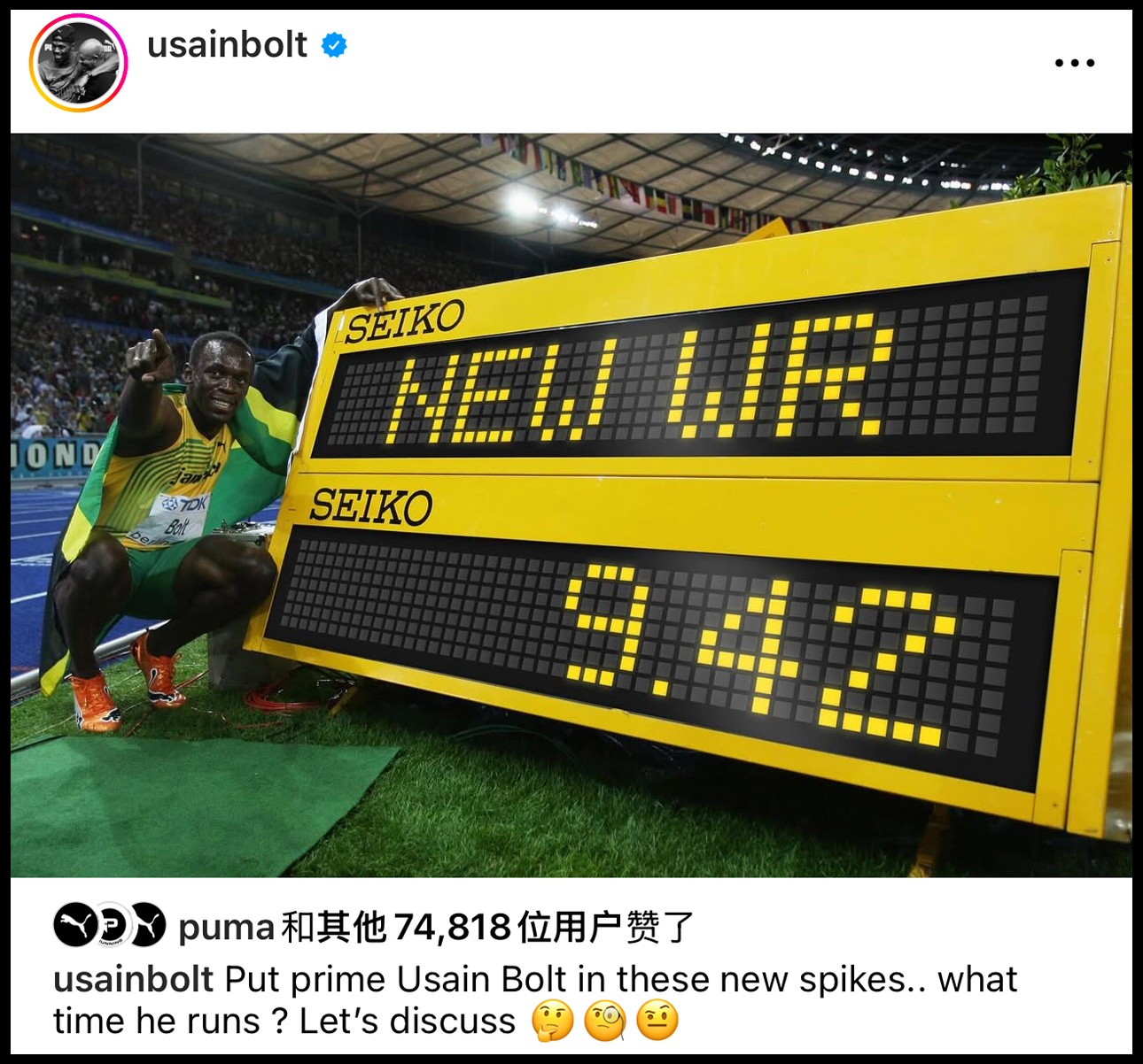 有意思的是,博尔特刚刚晒出个人 9 秒 42 的全新世界纪录,他表示,如果当年穿上 PUMA 现代最新科技钉鞋,通过科学研究数据推算,当年柏林世锦赛的世界纪录可能提升至 9 秒 42,更加逆天。