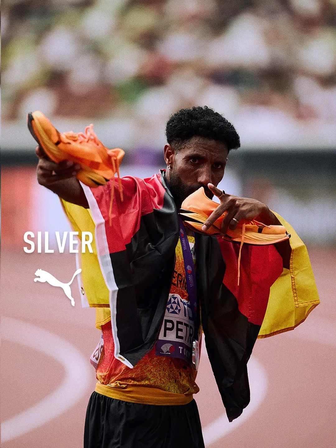 在昨天结束的 2025 东京世界田径锦标赛马拉松比赛,PUMA 签约运动员、德国田径名将阿马纳尔·彼得罗斯(Amanal Petros)以 2:09:48 完赛,获得成绩并列第一,以百分之 3 秒的微小身位差距夺得银牌。