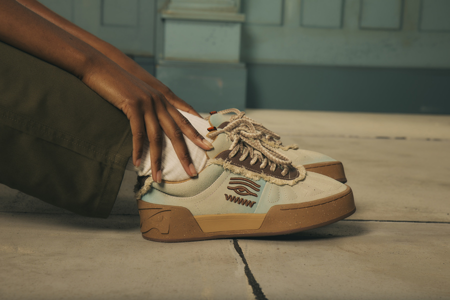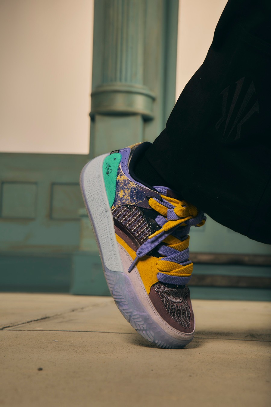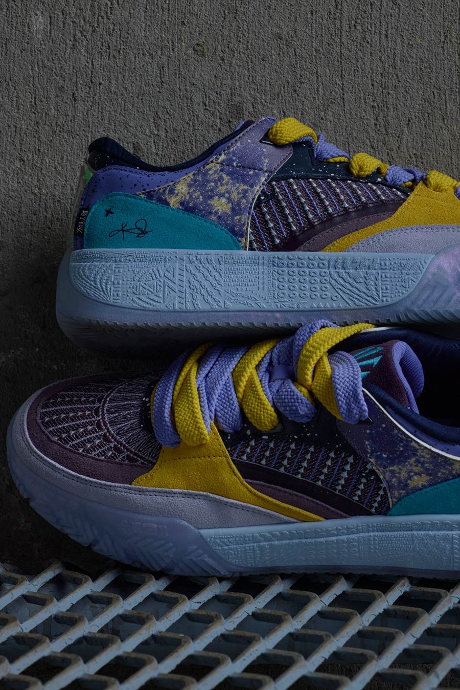 中底部分通过抬升的厚底结构与部落图腾雕刻提升视觉层次,鞋面采用头饰灵感刺绣,结合麂皮绒、皮革与 Kai Code 象形文字纹理,彰显鲜明的个人风格。