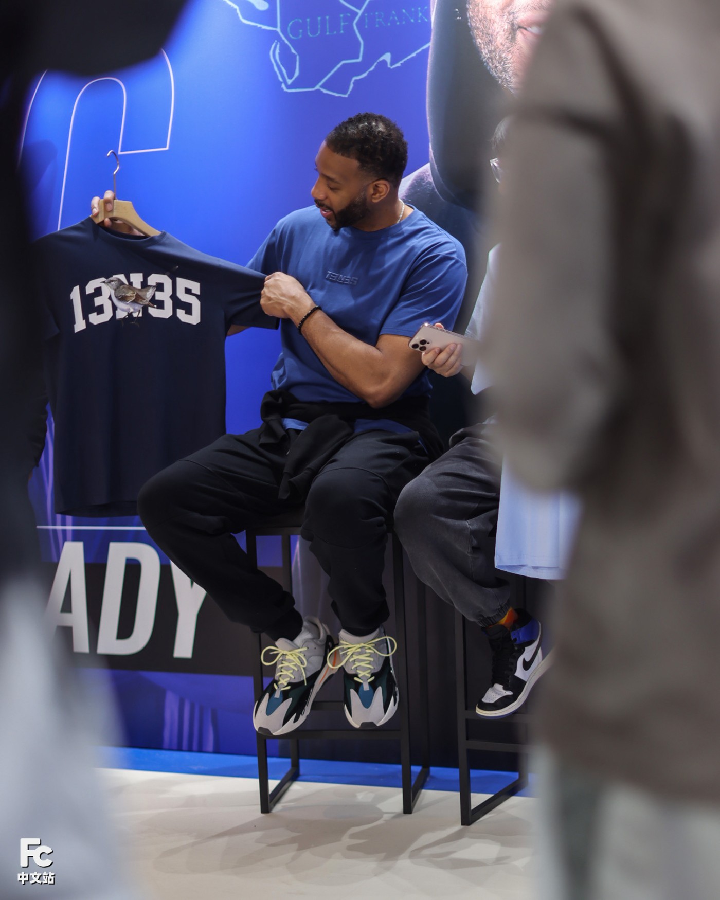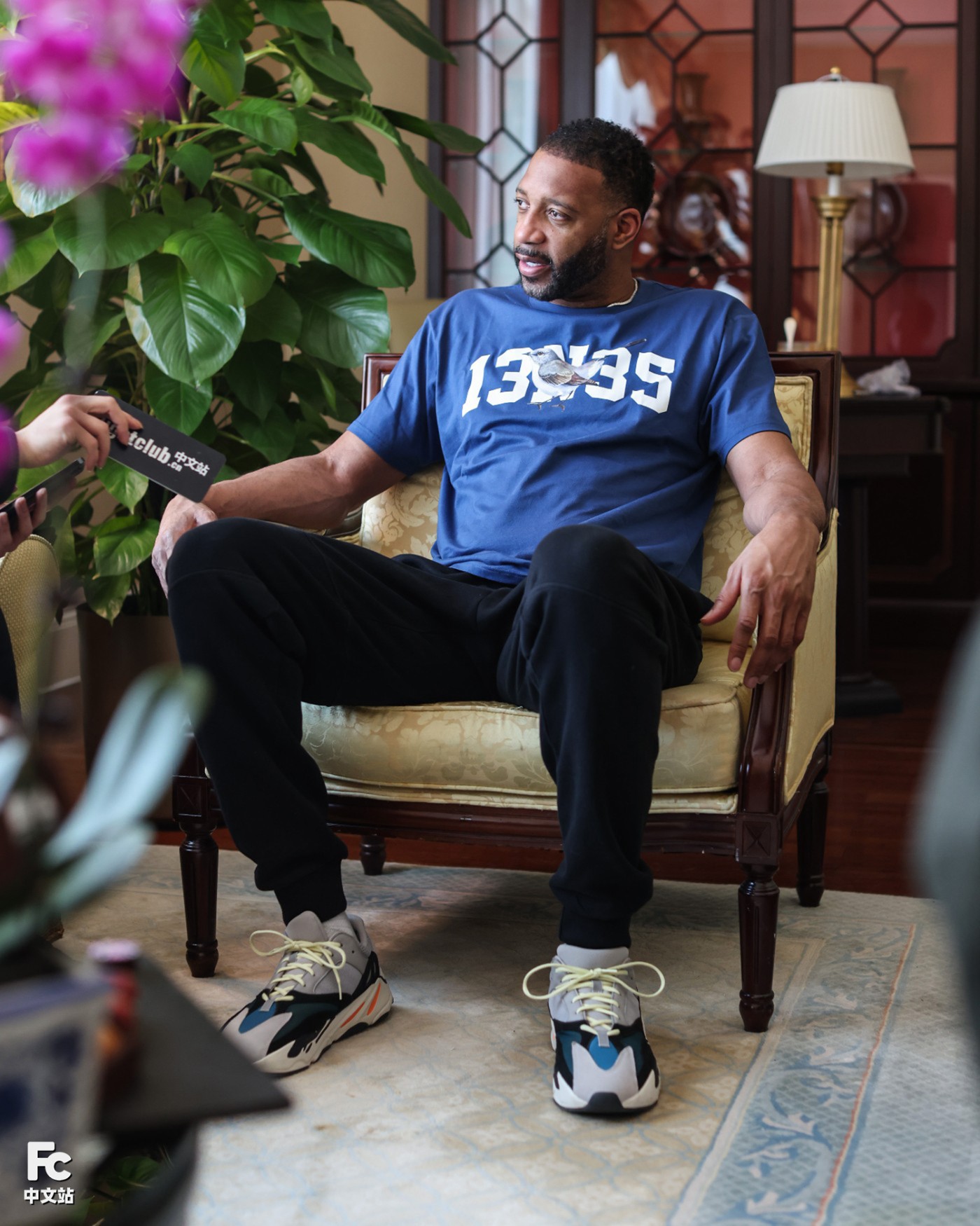 当天他上脚了一双 Yeezy Runner 700,并且我们非常直接的问出了那个问题。