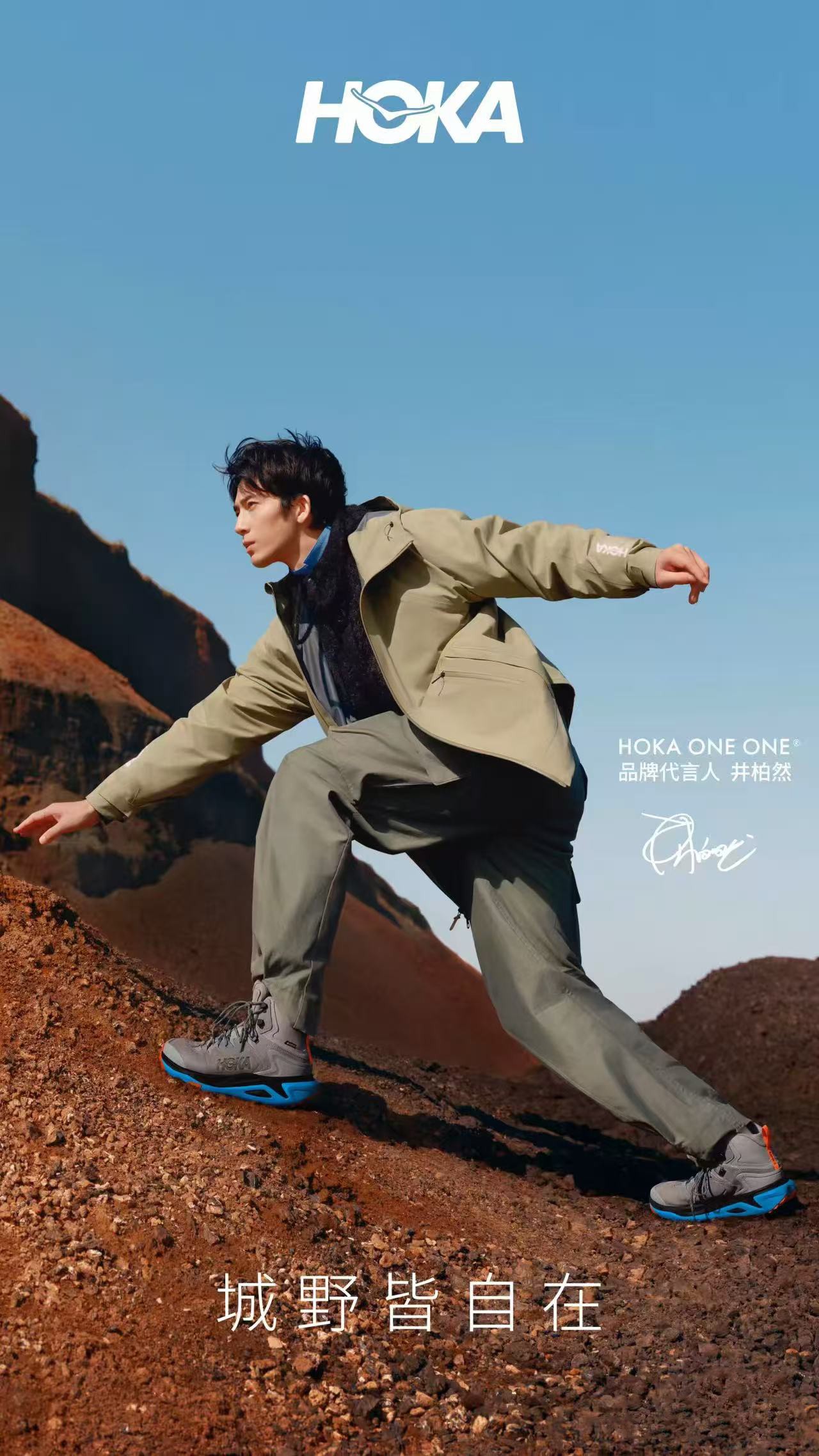 作为 HOKA ONE ONE 品牌代言人,井柏然一身机能装扮出镜,上脚了 Kaha 3 GTX。
