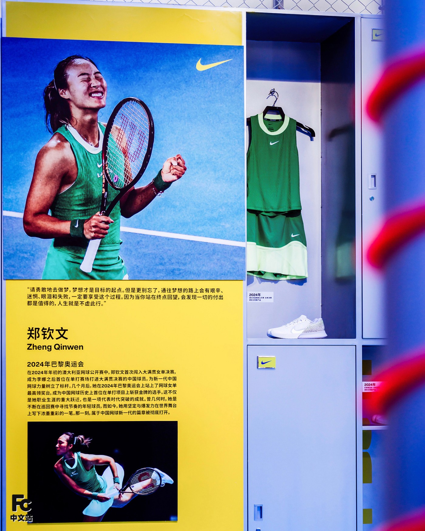 现场 Nike 还特别打造了一个网球历史的展览空间,从阿加西的惊天逆转,到李娜的突破时刻;从莎拉波娃、纳达尔、塞雷娜·威廉姆斯的辉煌篇章,到郑钦文、阿尔卡拉斯、辛纳和大坂直美的新生代崛起,这里都悉数陈列着经典瞬间的专属装备。