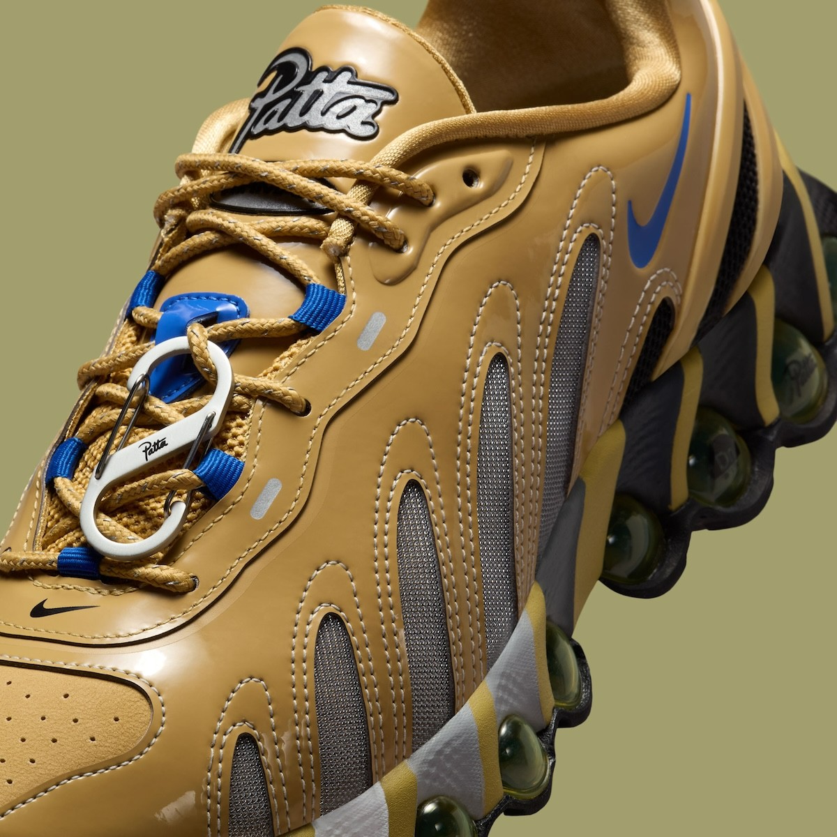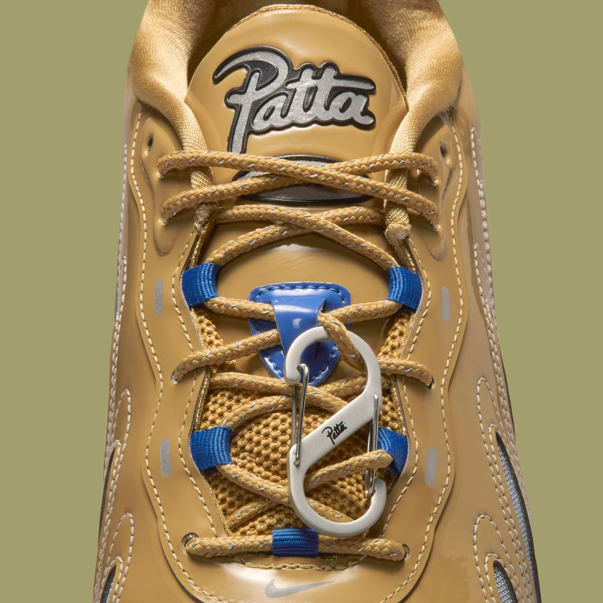 为该鞋配备了可拆卸的登山扣,鞋带也是圆柱形,在 Patta 的操刀下更有户外氛围。