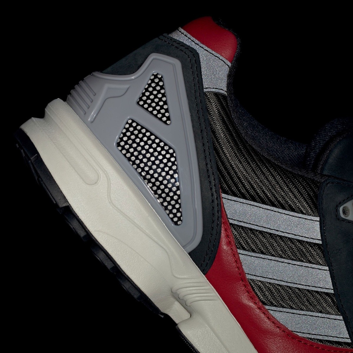 ZX 8500 融合了 ZX 8000 和 ZX 9000 的经典元素,黑红配色(货号 KJ8964)再现了梅赛德斯车队的赛车服,银灰配色(货号 KJ8965)则更为清爽,也更便于穿搭。