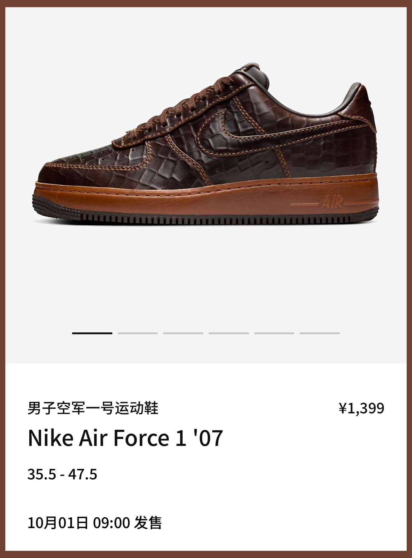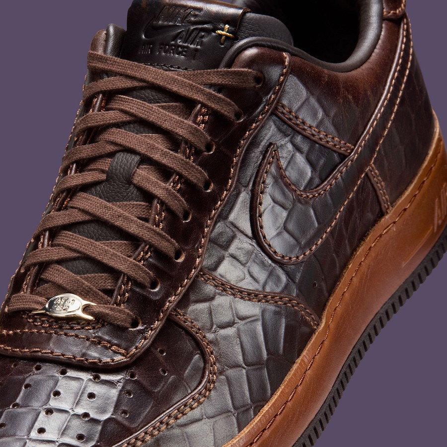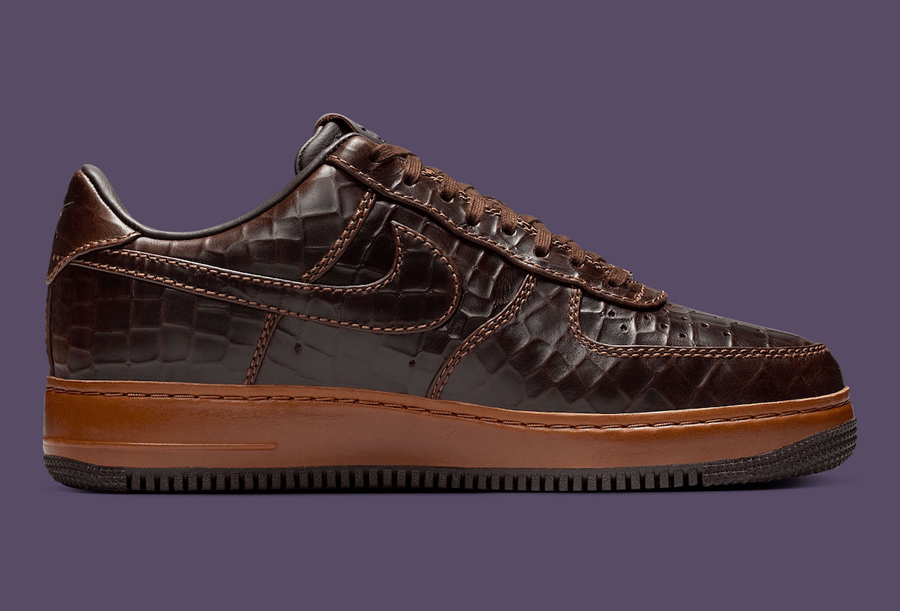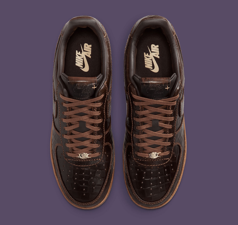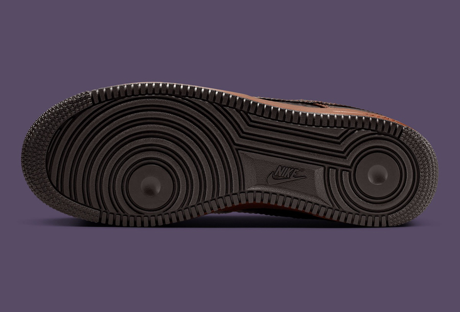 整体造型采用 Air Force 1 '07 为蓝本,棕色鞋面采用独特的纹理压花示人,搭配同色系皮质中底与车线勾勒,释放出精致高档的独特格调。