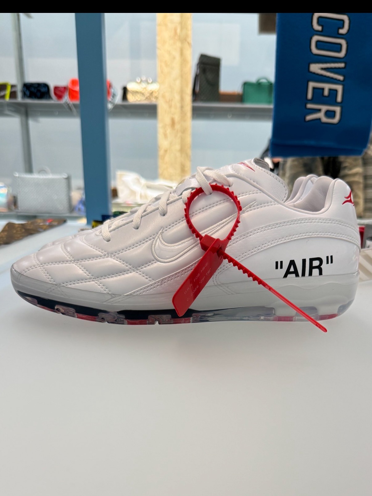 除了标志性的 OFF-WHITE 字体和红色独特吊牌外,原本裸露的鞋钉被一层水晶外底包覆。