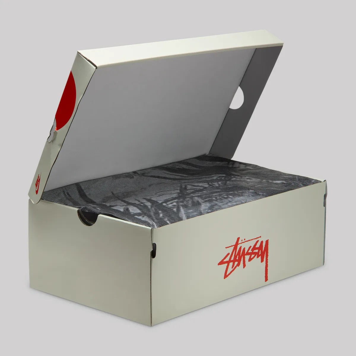 Stussy 的经典刺绣标志则呈现在后跟处,鞋盒也是特别的视觉主题。