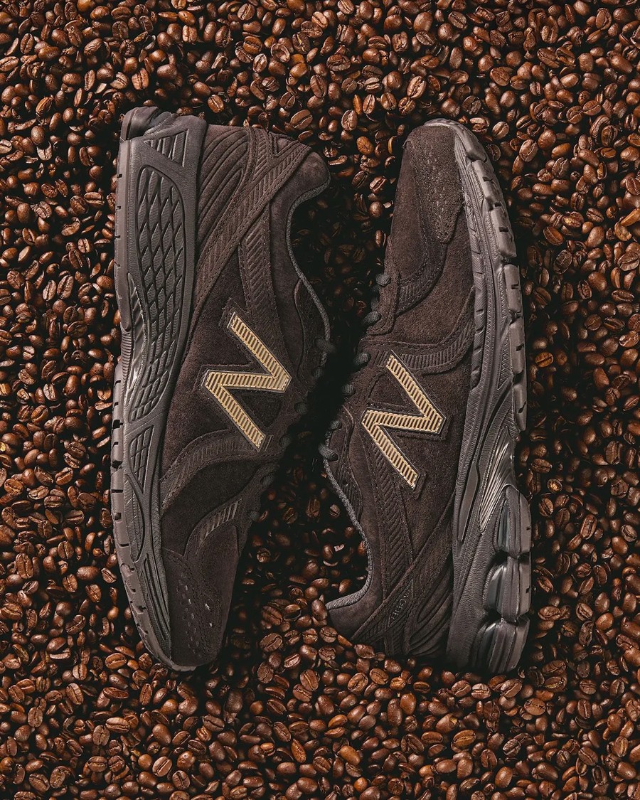这次双方以 New Balance 860v2 鞋型为载体,选用 Espresso 浓缩咖啡为灵感,将棕褐色覆盖整体鞋身及大底,金色点缀鞋侧 N 字 Logo 及鞋舌。