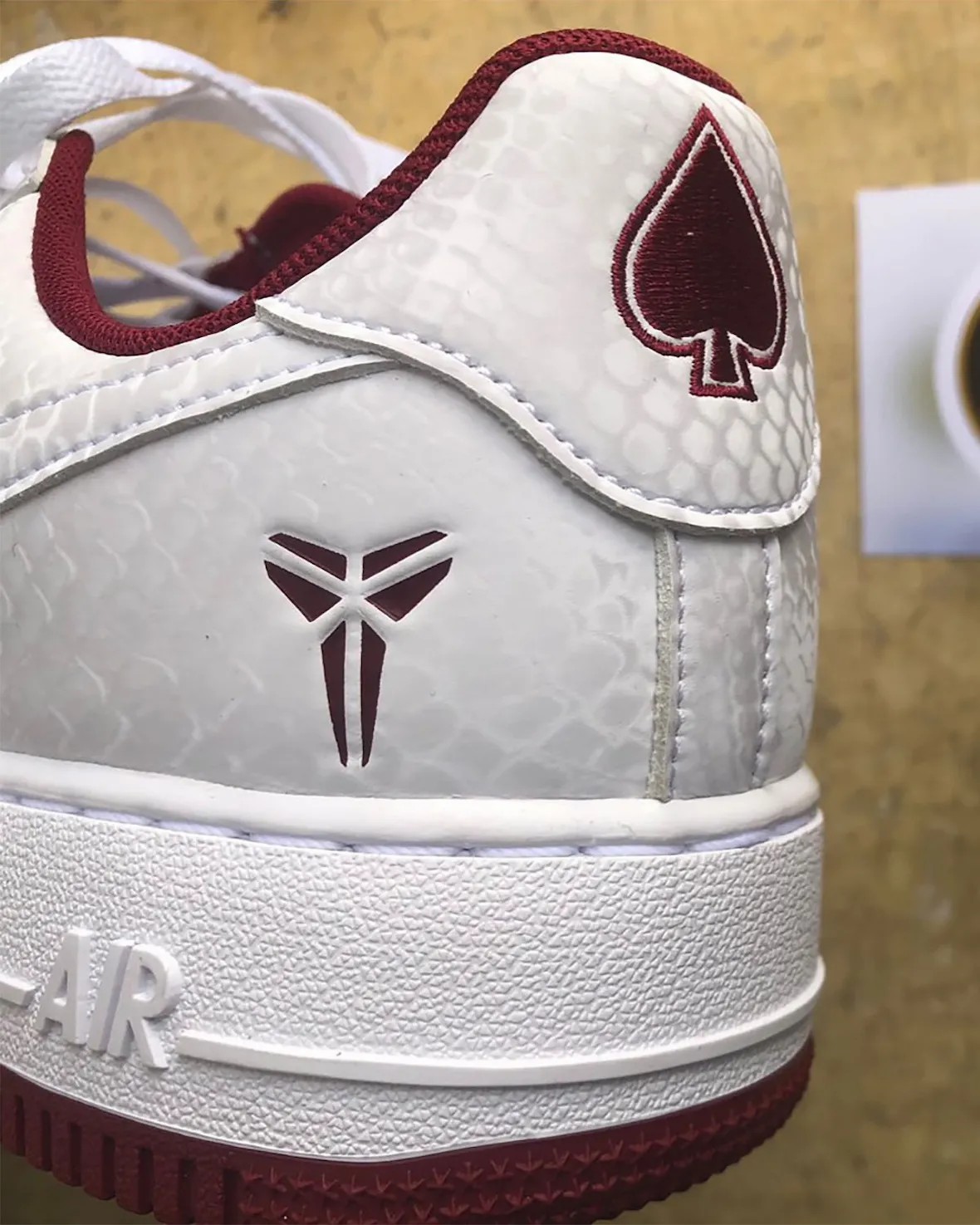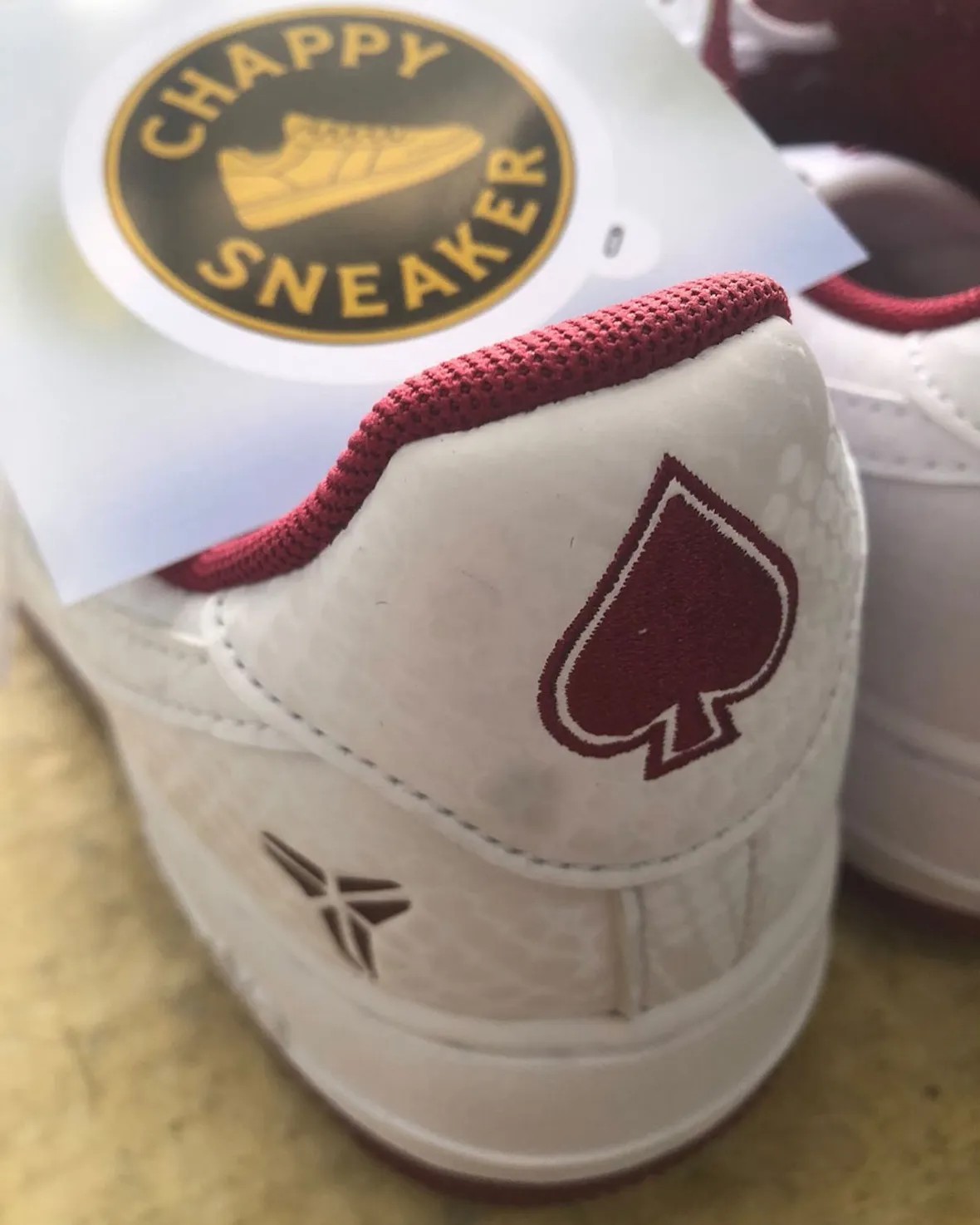不同之处在于细节改动,像是 8、24 刺绣后跟改为科比高中球衣号码 33 号,左脚后跟的黑桃标志则是他所在球队的扑克牌徽章。