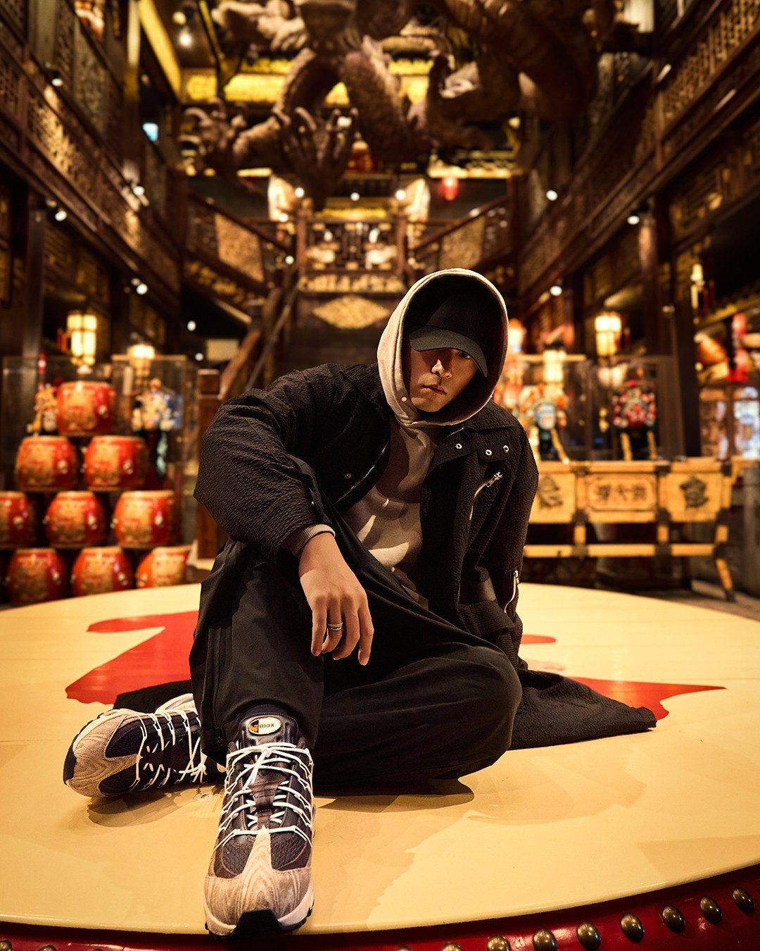 第二套造型是周董现身新鞋发布会,更有时尚大片的感觉。