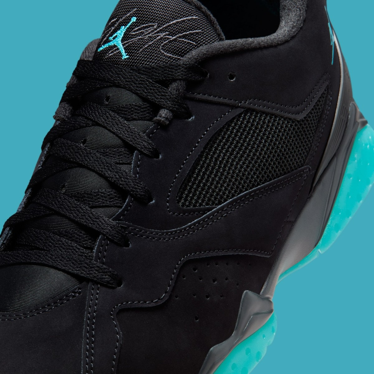 黑色绒面革 + 网眼鞋面赋予鞋子一丝神秘感,配合全掌夜光大底,更突出了这种氛围。