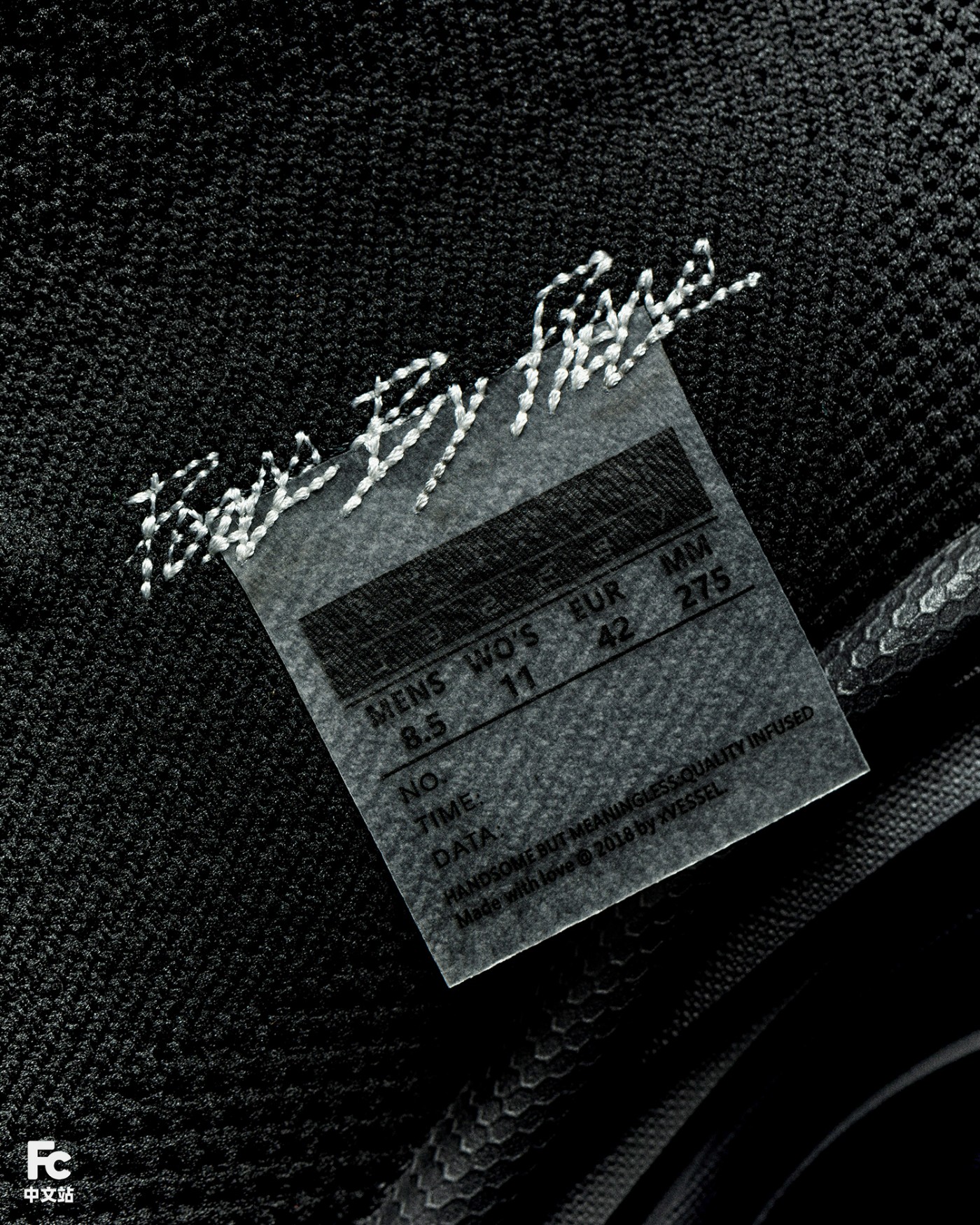 Peace by Piece 字样以刺绣形式呈现,并融入 xVESSEL 经典外露鞋标,展现标志性解构理念。