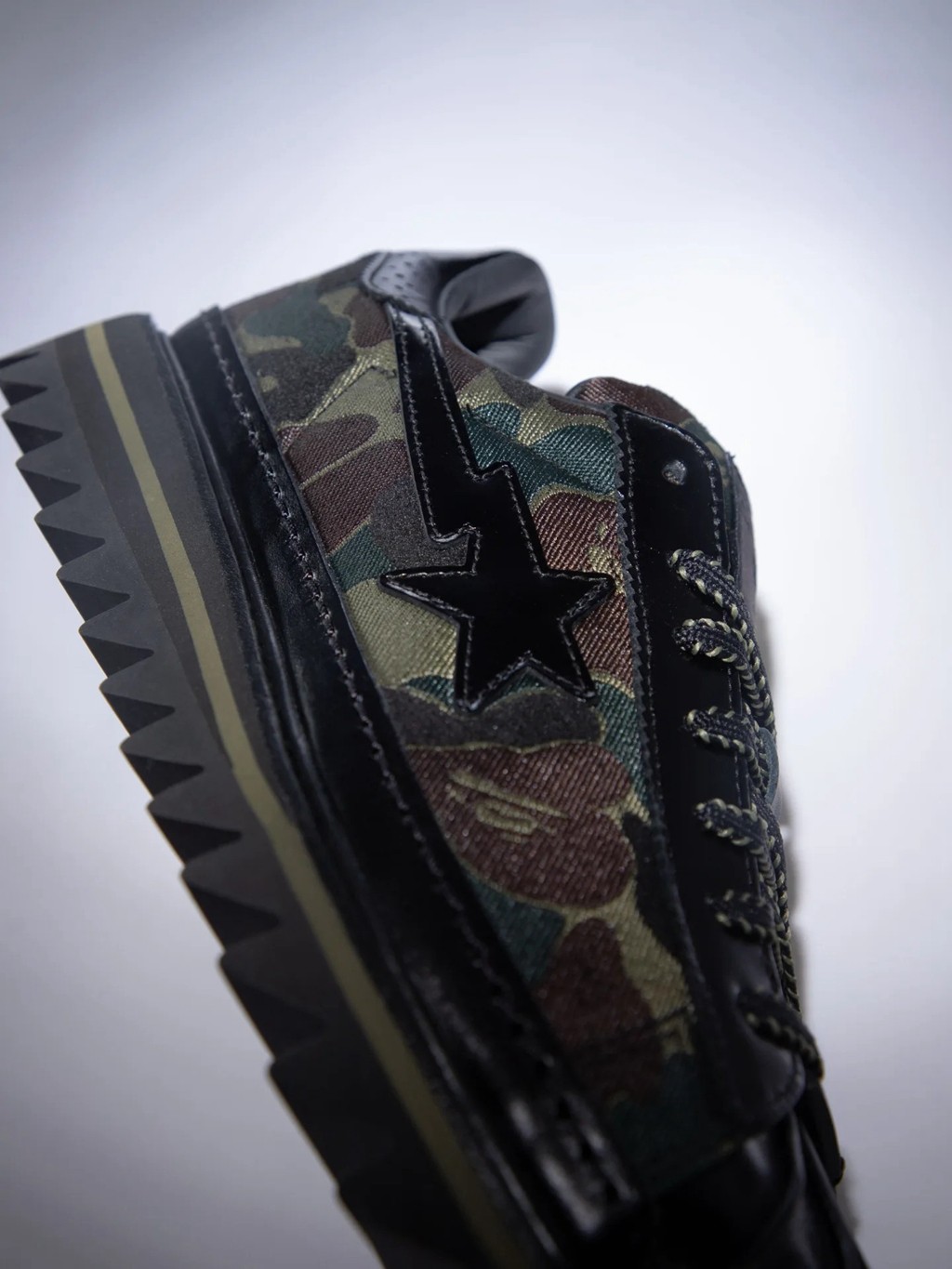 像是每只鞋里外不对称的三道杠和 BAPE 星星,与此同时图案也是延续了这一设计。