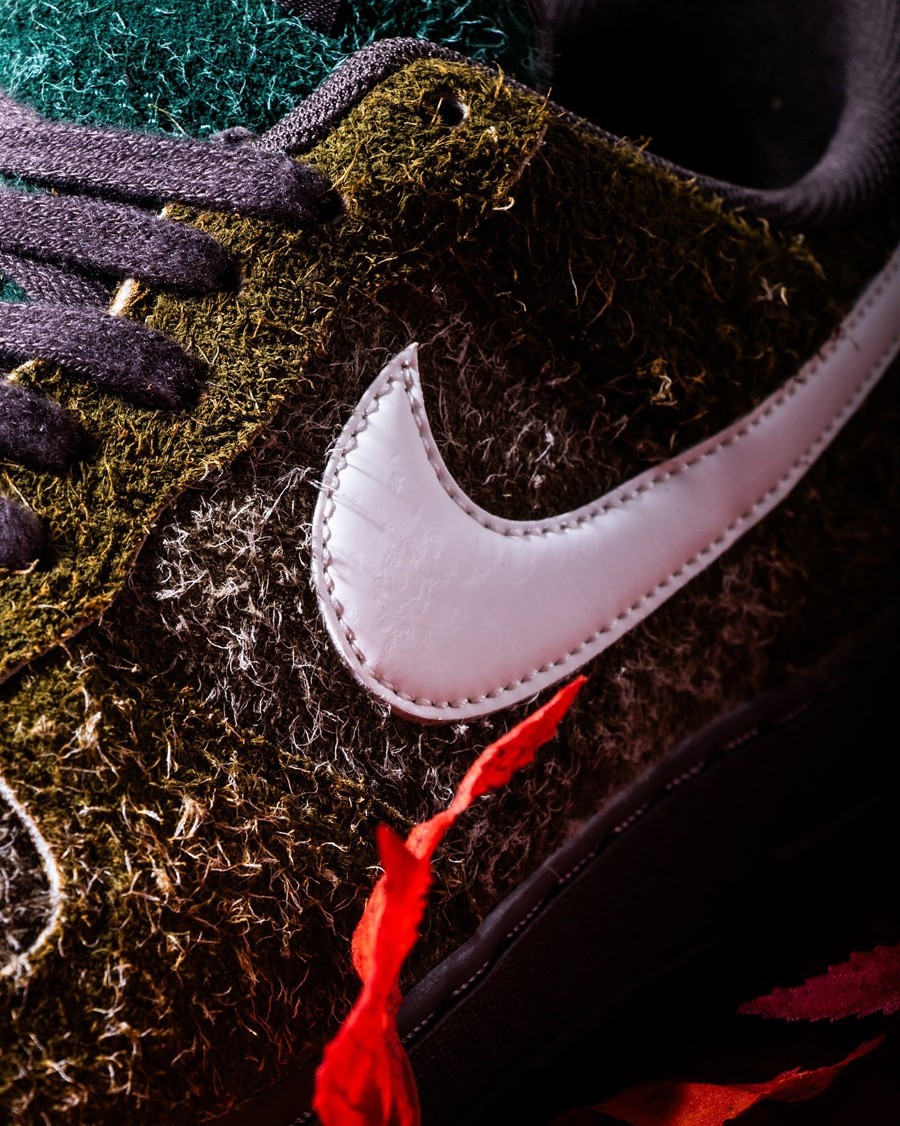 而掀开落叶的表面后,则露出棕绿植绒的鞋身本体,象征土壤大地的孕育基础。