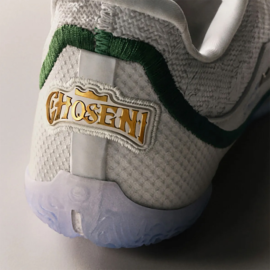 鞋款配色也呼应当时封面詹姆斯穿着的 St. Vincent–St. Mary 高中球衣,白绿装扮搭配鞋面立体雕花,非常耐看。