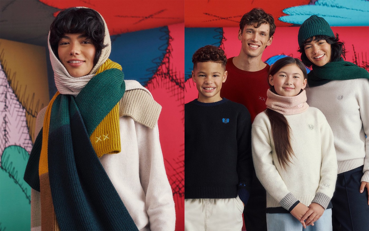 除了成人款和儿童款的多个织针衫单品外,本次还同步推出 6 款配饰,包括针织帽、手套、围巾等。