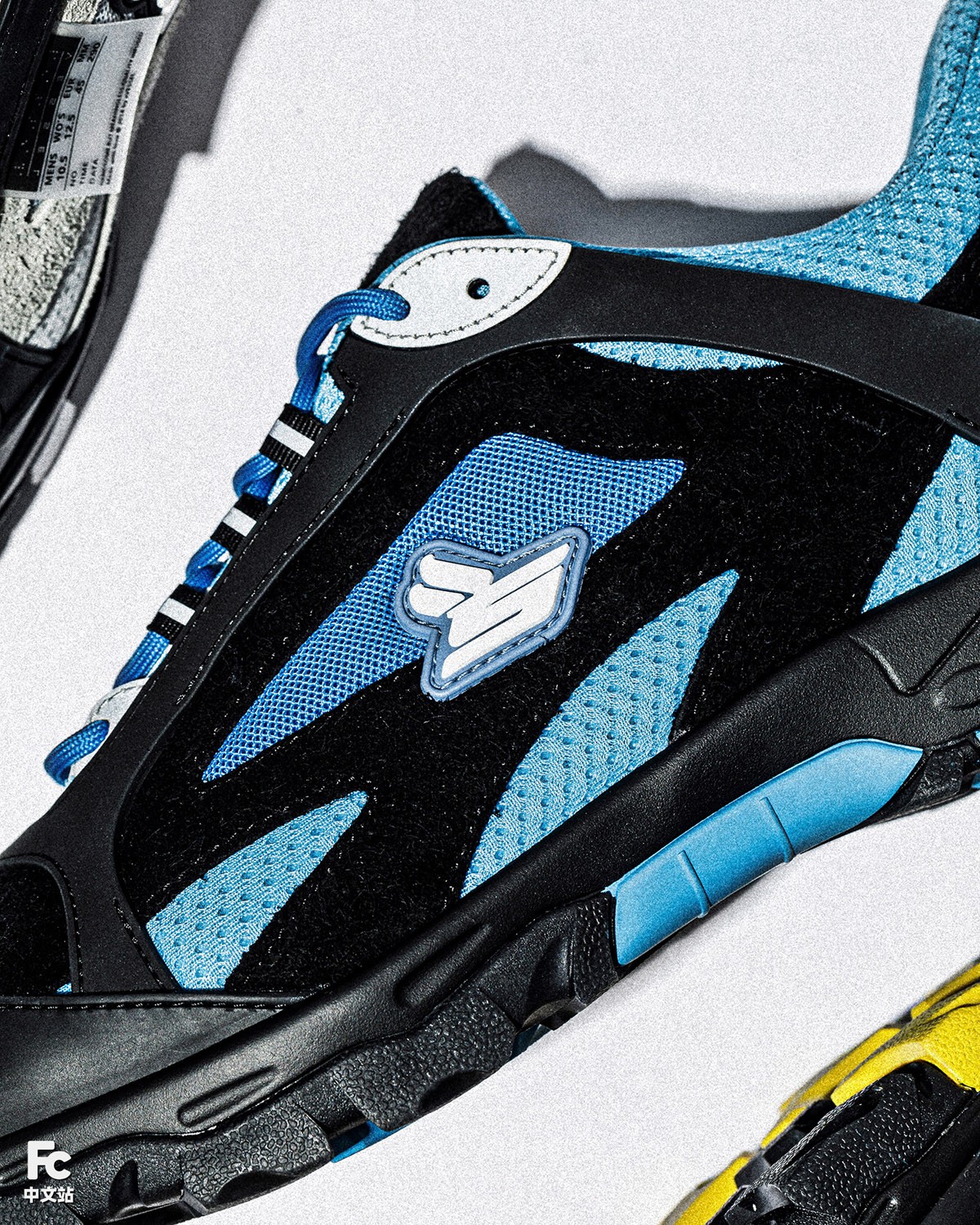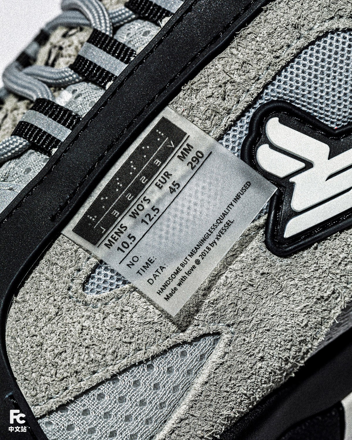 联名鞋款延续了原版 sicko 一模一样的整体设计,仅在细节处加入了 xVESSEL 的标志性元素——外露的尺码标。