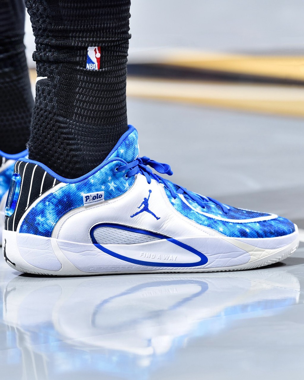 这双是专门为他打造的 Jordan Tatum 4 PE,致敬了被誉为 “史上最帅球衣” 的魔术复古星条纹球衣。