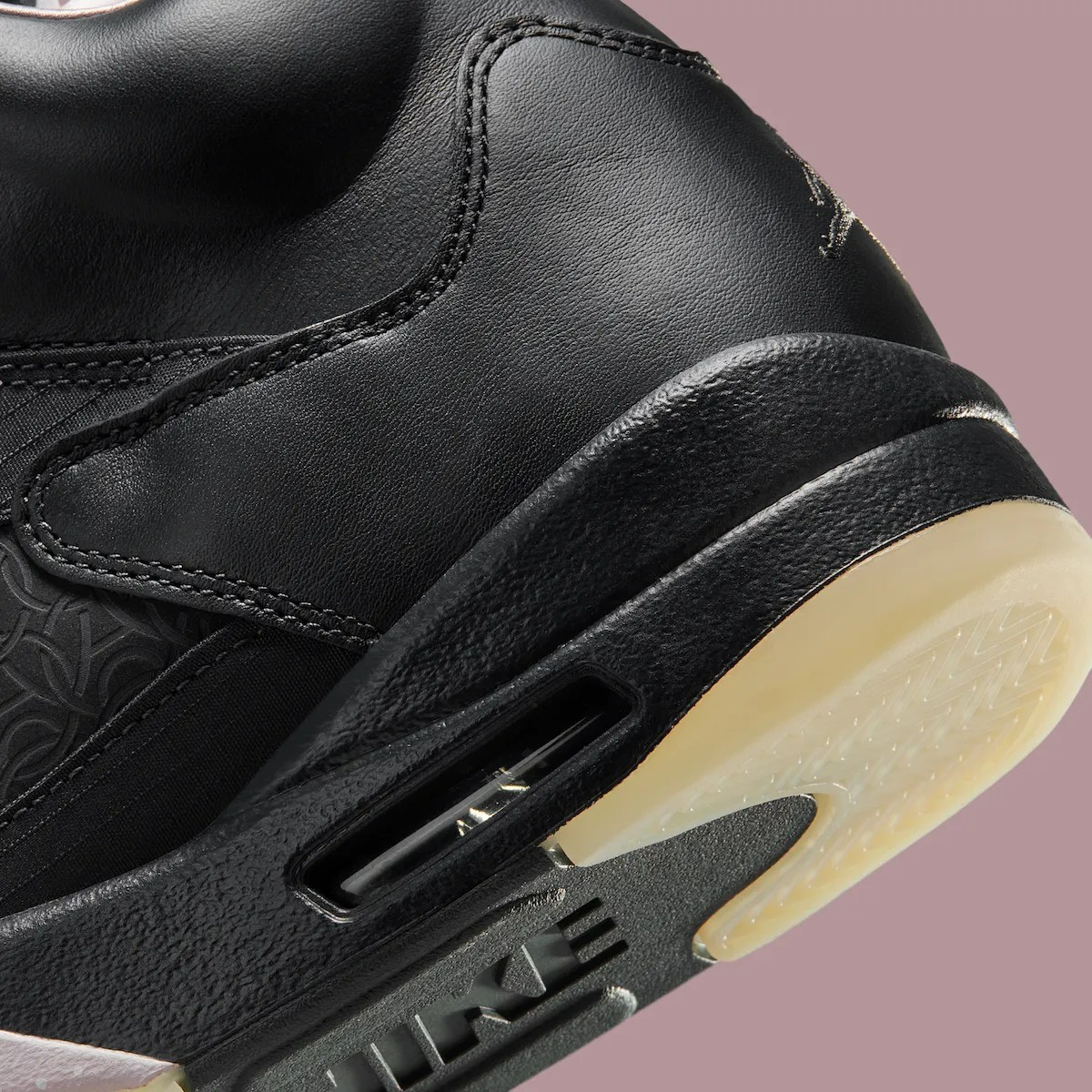鞋面大胆使用格纹织物 + 皮革的组合方式,PSG Logo 暗藏于 AJ5 标志性的鞋侧网眼。