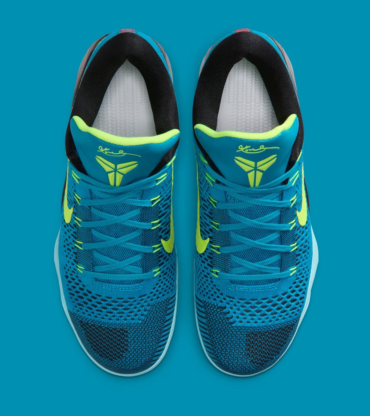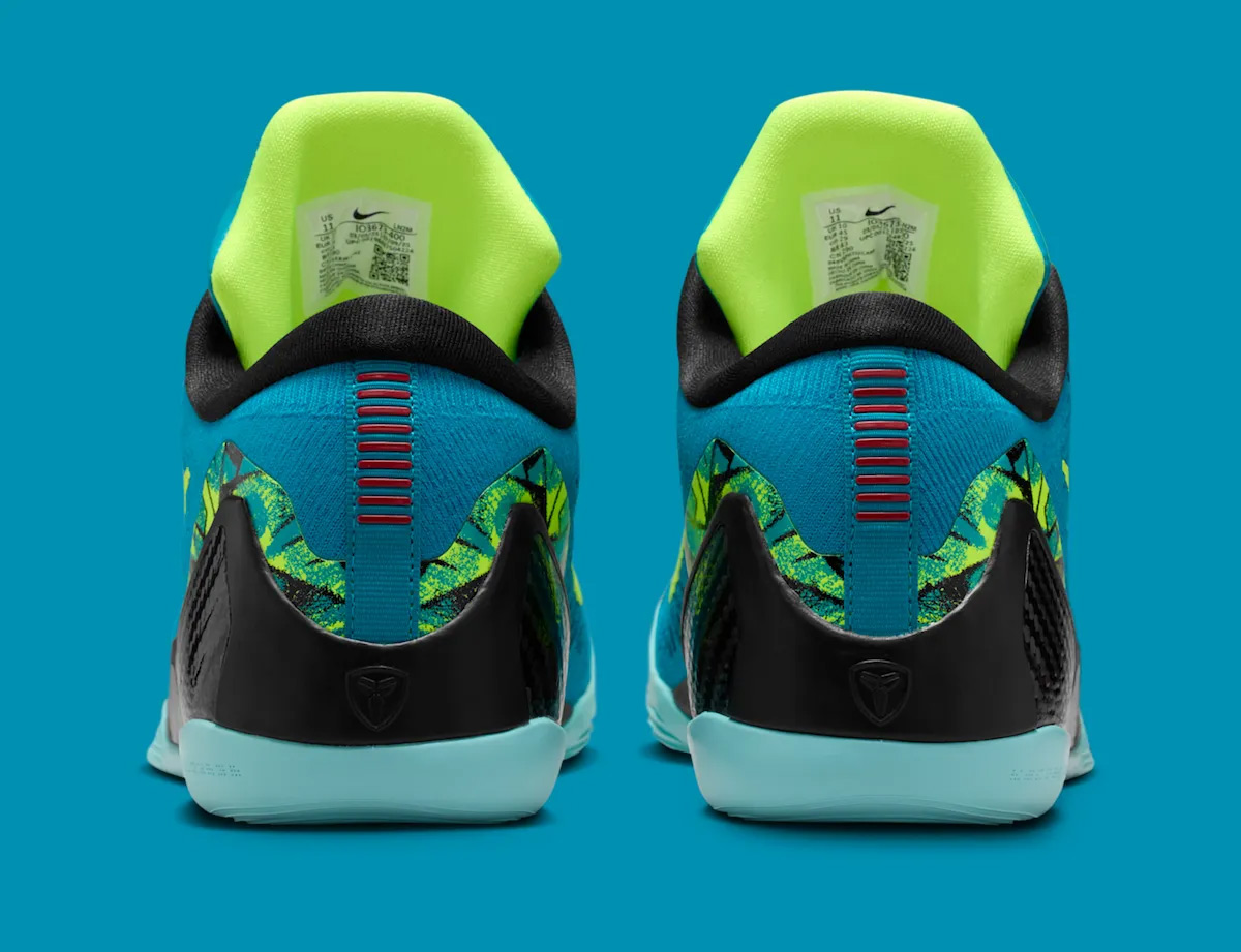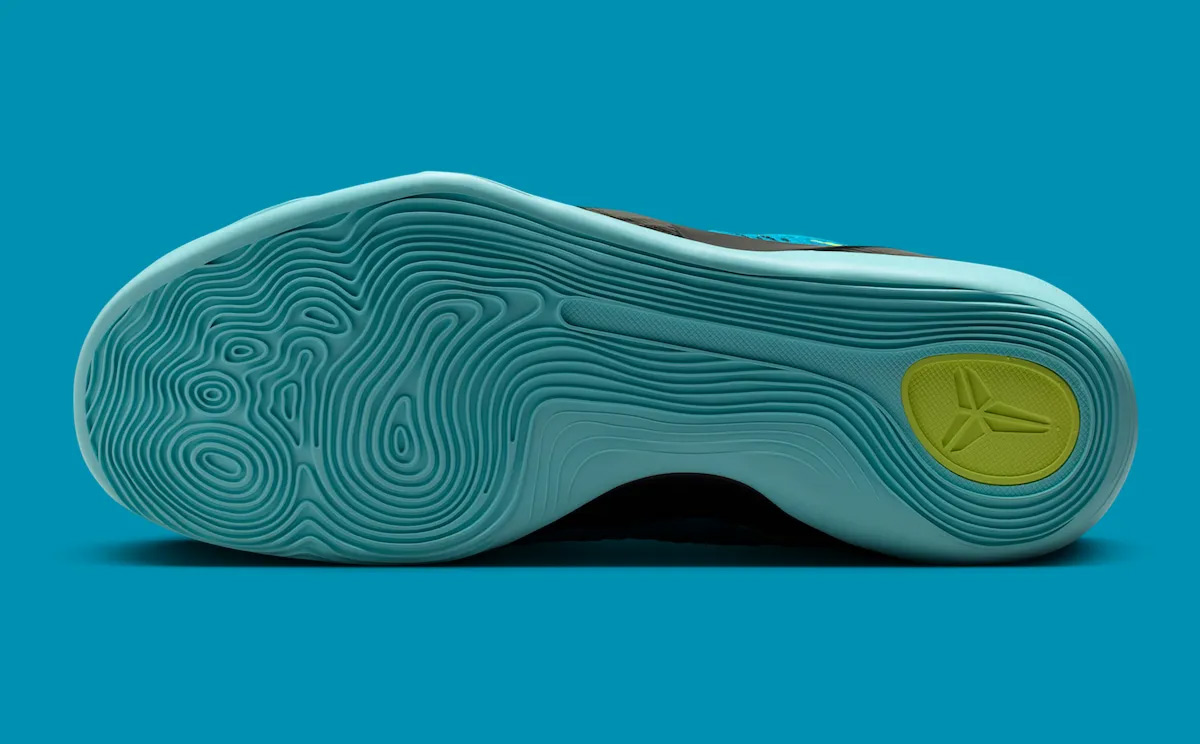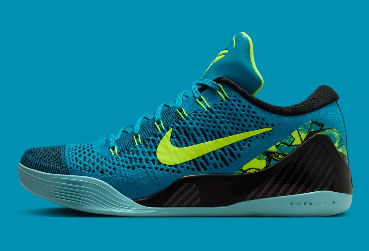 Nike Kobe 9 Elite Low Protro "Perspective" 在本系列里算是一款比较亮眼的配色,以绿松石色作为主色调,点缀亮眼的荧光黄细节。